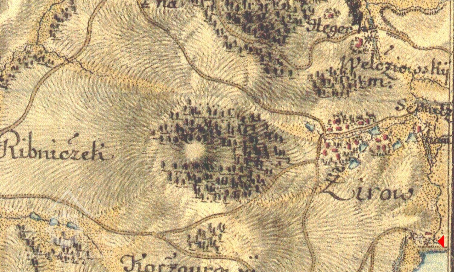 mezi obcí Žirov a Zachotín, pod hrází rybníka