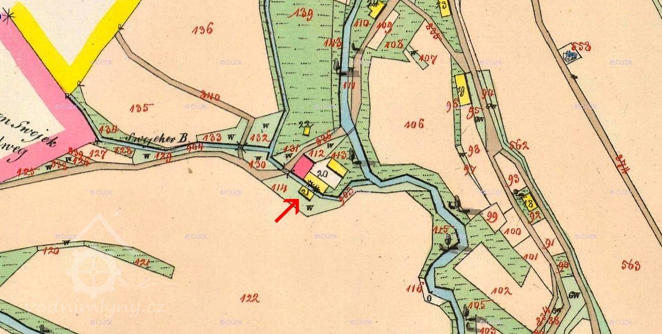 Popis1930: 1 kolo na svrchní vodu, hltnost 0,06 m3/s, spád 9,26 m, výkon 4,44 HP