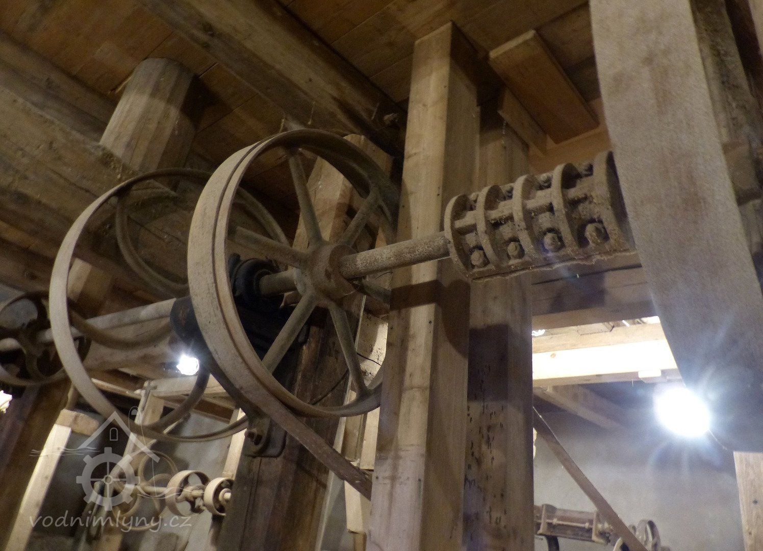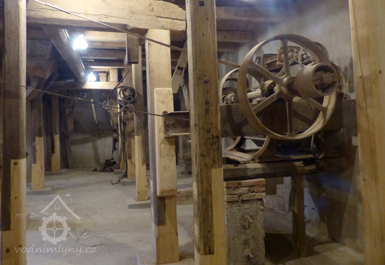 Interiér mlýnice, 2011, © Jan Pešta, (Prvky na obrázku: transmise, řemenice, převody - transmisní hřídele s řemenicemi (výrobek průmyslový i řemeslný), mlýnská hranice, válcová stolice)