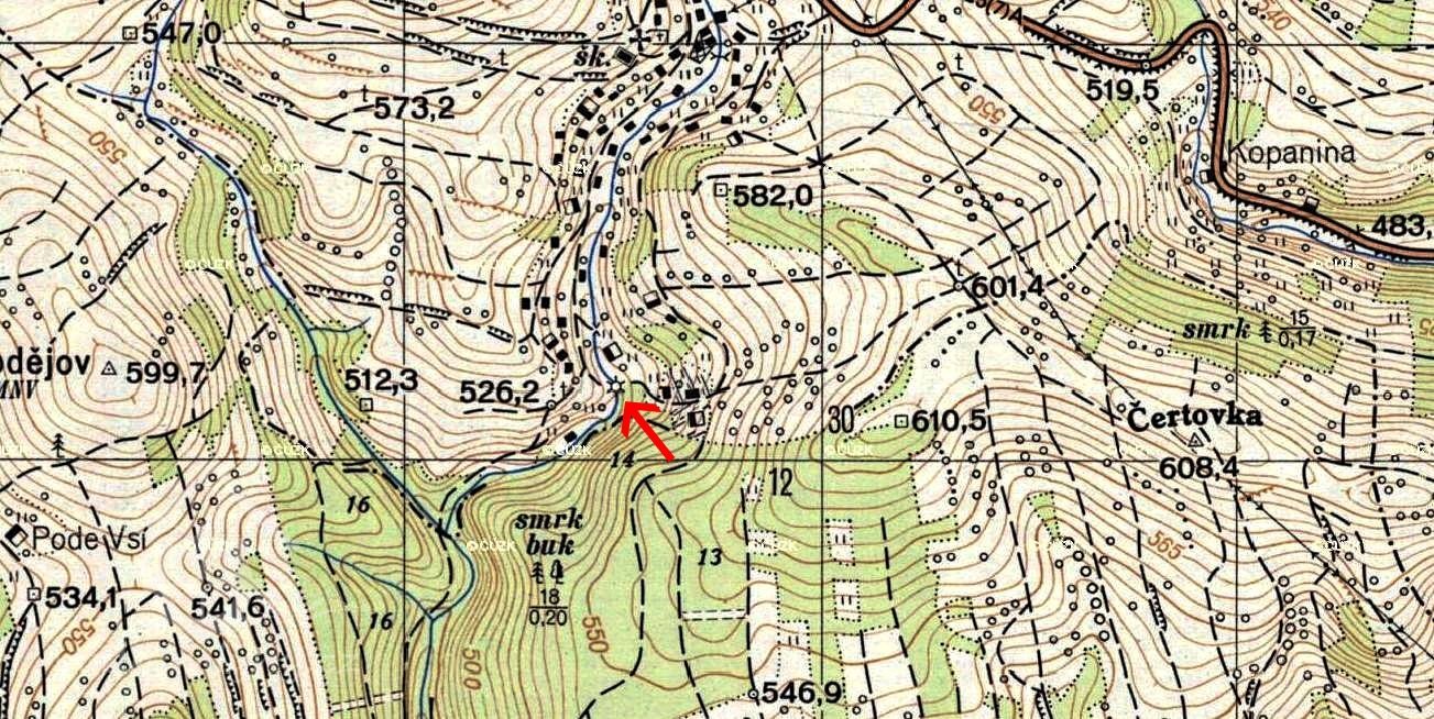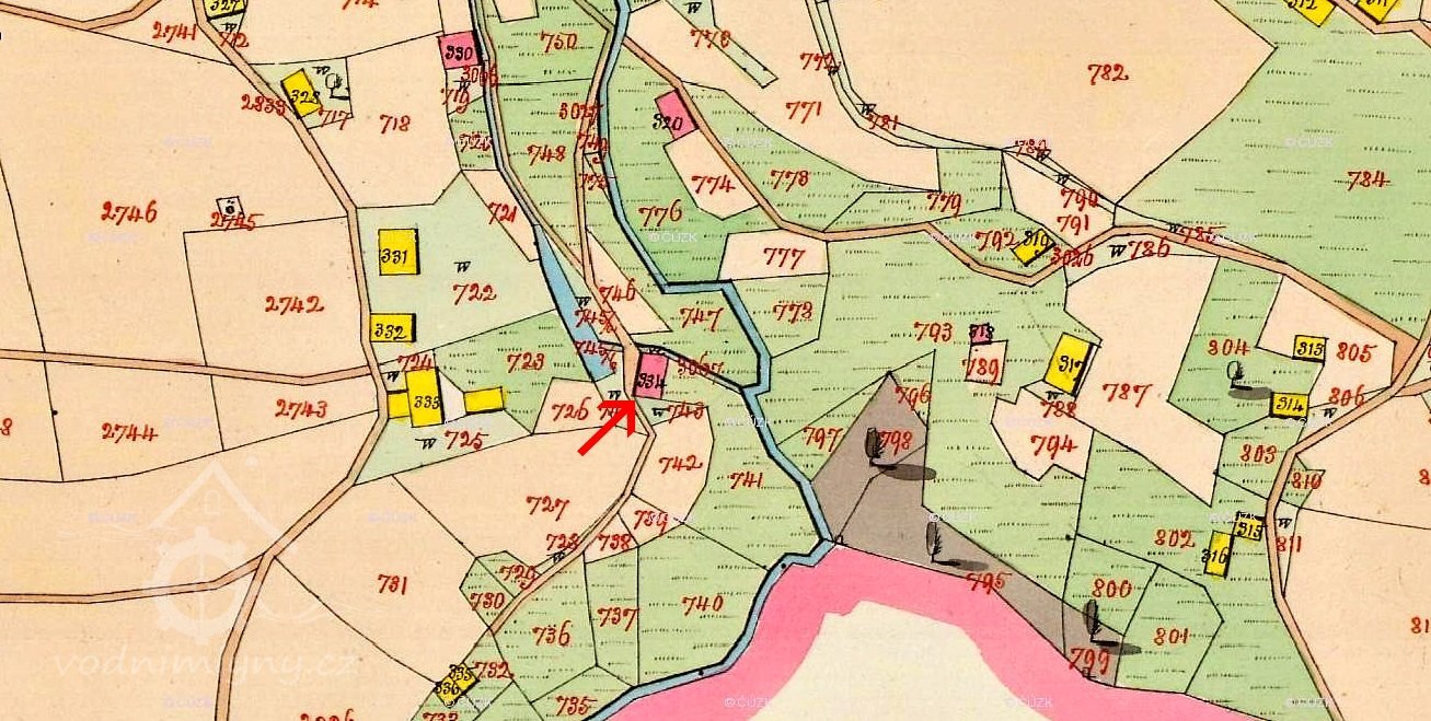 Mlýn se nachází 850 m jižně od kostela Nejsv. Trojice.