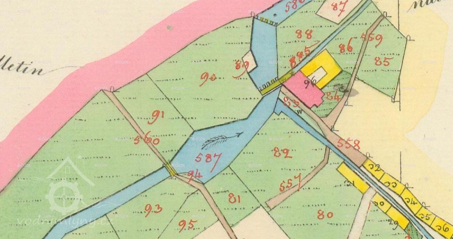 „Leží na pravém přehu řeky Blánice, z jejíhož pravého břehu odbočuje mlýnský náhon přivádějící vodu „Leží na pravém přehu řeky Blánice, z jejíhož pravého břehu odbočuje mlýnský náhon přivádějící vodu ku pohonu mlýnského zařízení. Za tím účelem je zřízen v řece pevný jez 17,1 m dlouhý. Ve svém středu má splav 8,4 m široký, opatřený v celé šíři prkennou podlahou. Přímo nad jezem odbočuje horní mlýnská stoka opatřená dvěma stavidly spouštěcími. Asi 10 m nad stavidly ústí do Blanice potok Pfarrbach, jehož vyústění opatřeno jest při pravém břehu kamenným tarasem. Ve vzdálenosti 5 m pod spouštěcími stavidlami nalézají se v lednici stavidla mlýnská, z nichž stavidlo na mlýnský žlab měří 1,34 m, jalový žlab 0,71 m. Ku pohonu mlýnského zařízení slouží jedno kolo na spodní vodu měřící v průměru 3,5 m. Šířka věnce obnáší 1,5 m. Pod mlýnem na spodní mlýnské stoce nalézá se pila, jejíž kolo měří 3 m v průměru a pohání jednu rámovou pilu a jednu lupenou.“