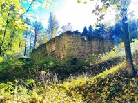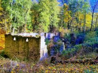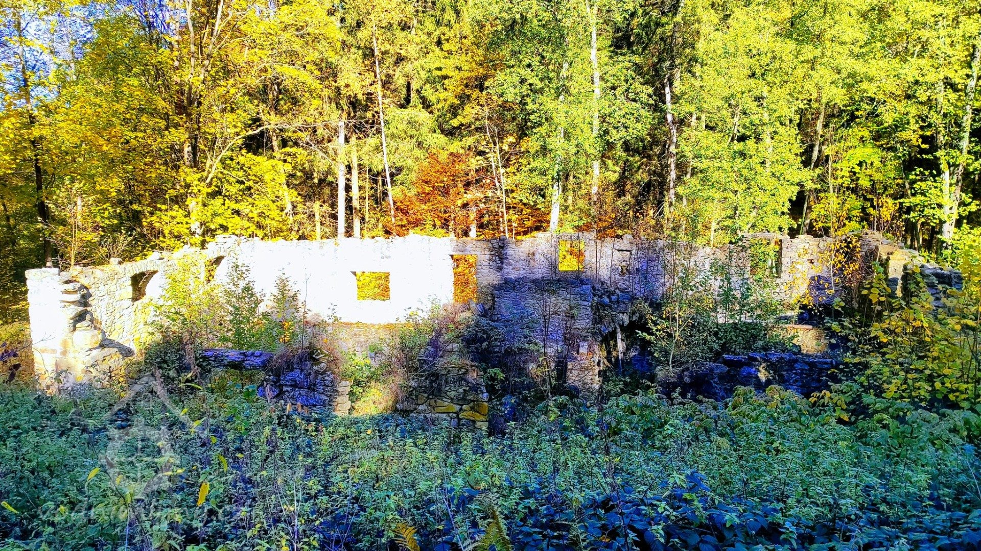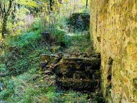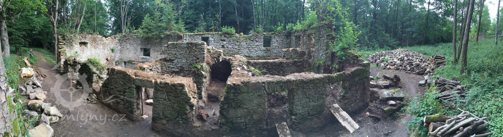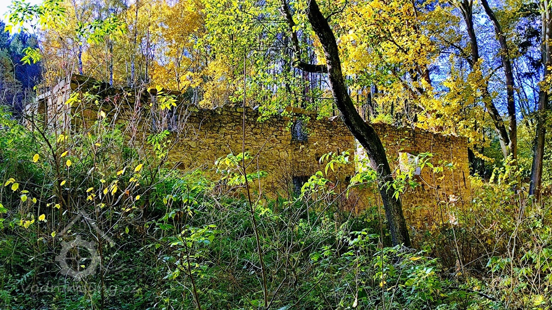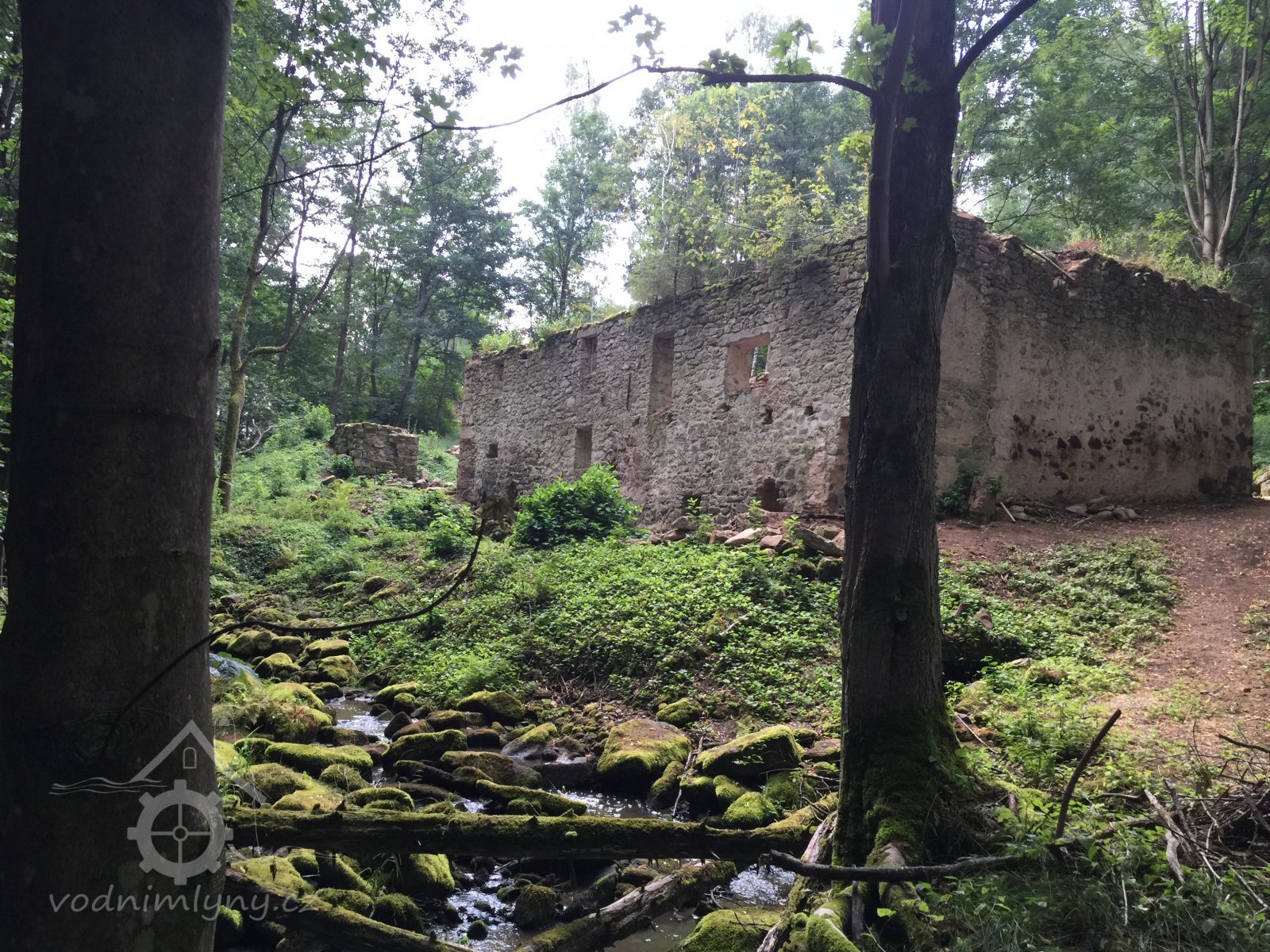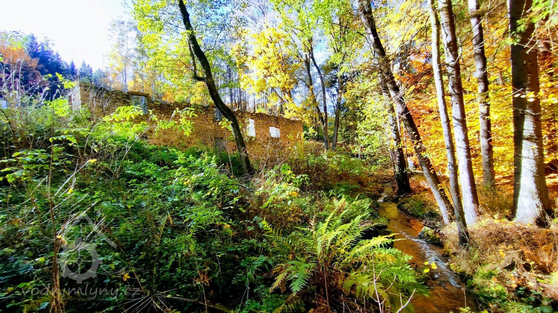 Mlýn na Klenském potoce. Technické vybavení mlýna neexistuje, pouze zachovalé zdivo.