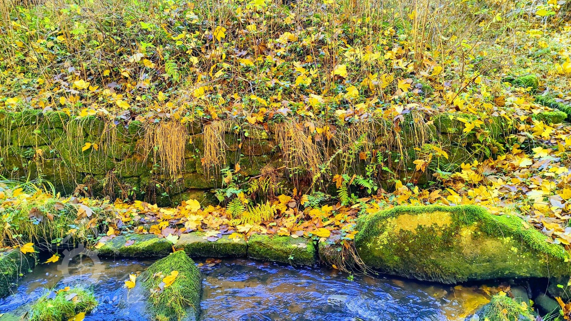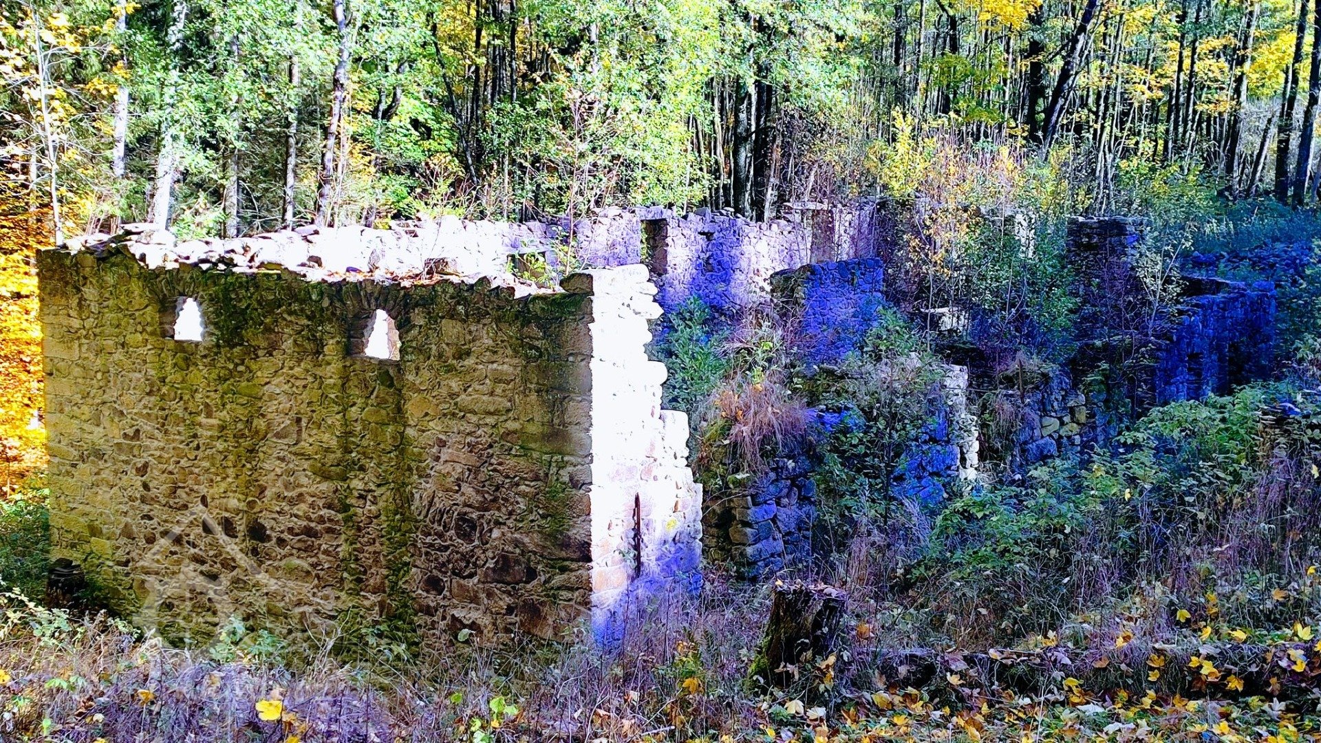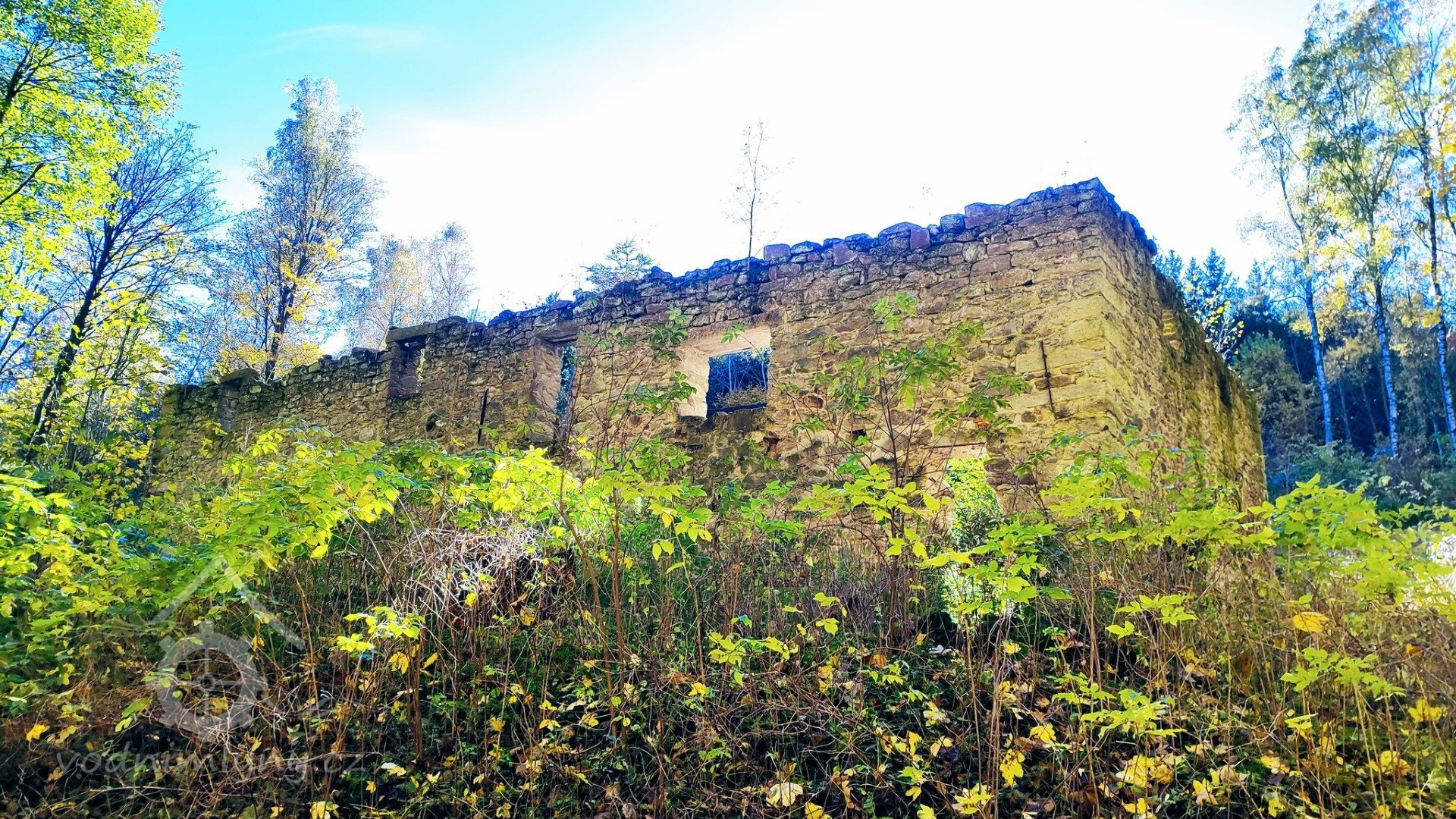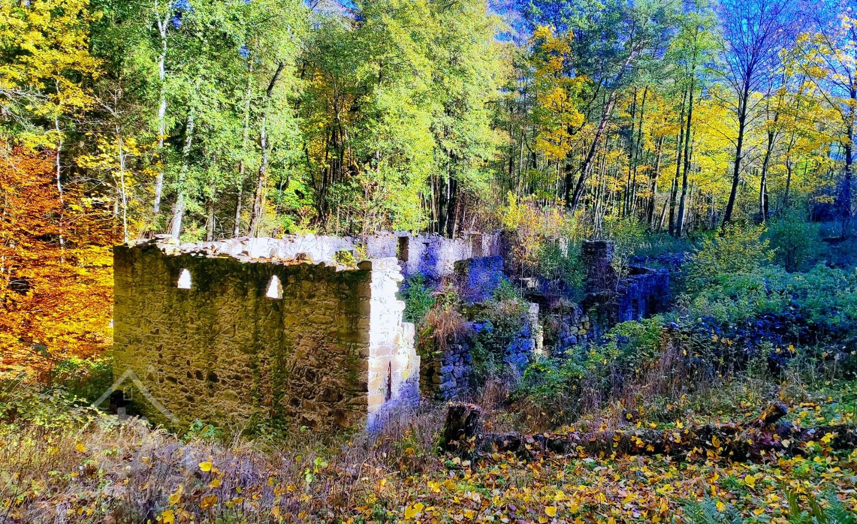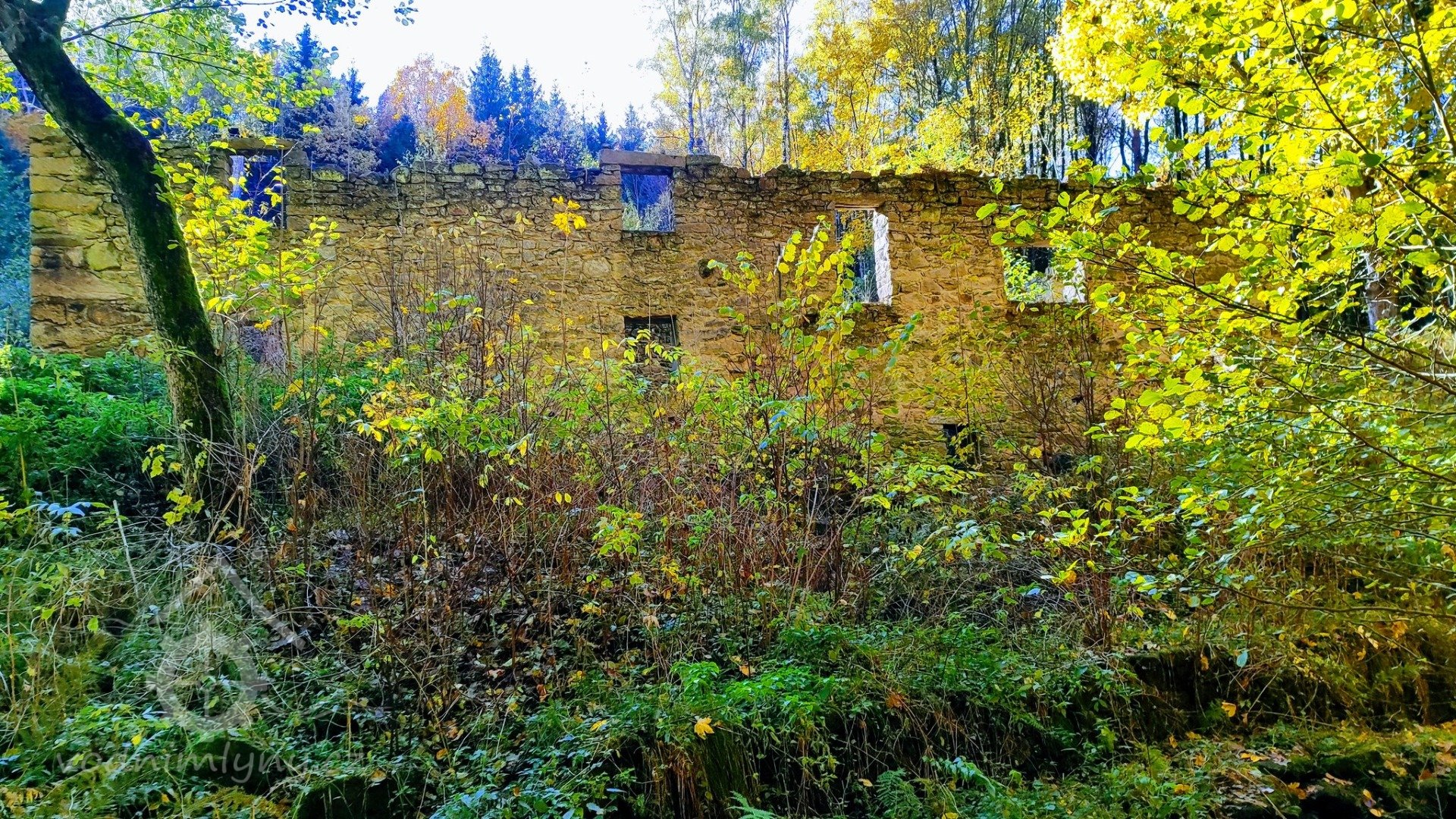 Mlýn na Klenském potoce. Technické vybavení mlýna neexistuje, pouze zachovalé zdivo.
