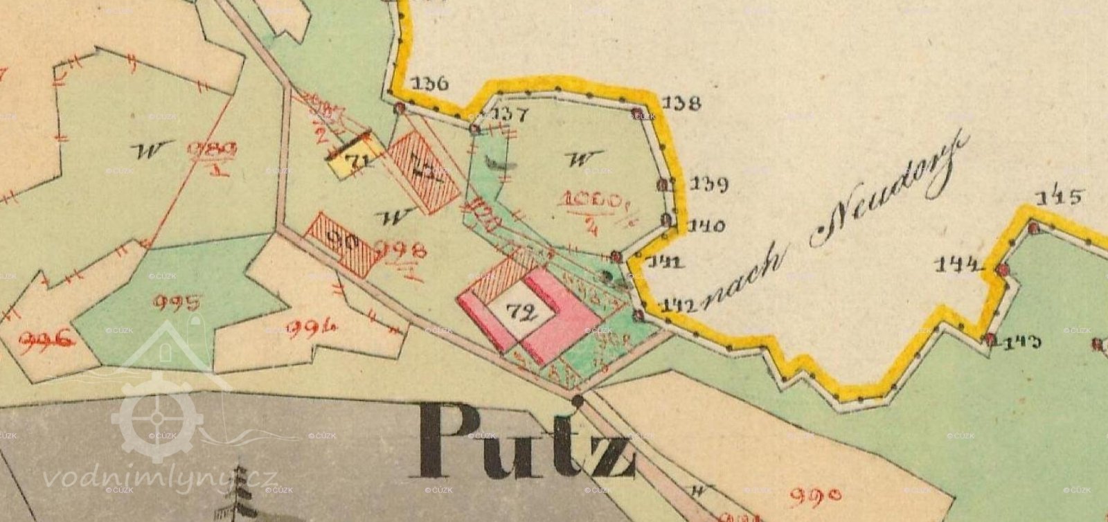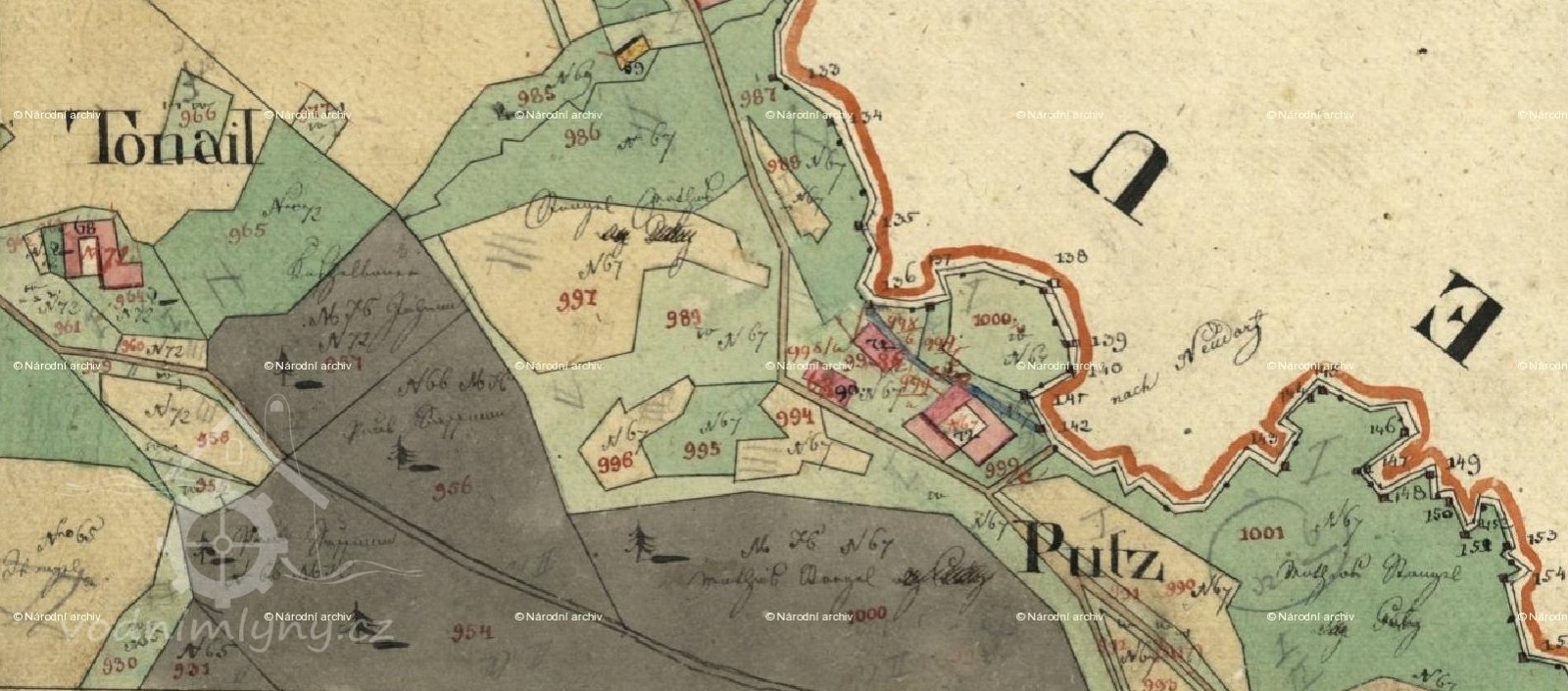 označován jako Putzn mlýn, PutznmühlePutz, mlýn Kroha  (zeměpisná lokace dle nedaleké samoty), údajně zde měla být i pila, šlo o stavení č.p. 86 , 67 a 68, patřící rodině Stangl a Schwarz (https://zanikleobce.cz/index.php?obec=16775) (PK)