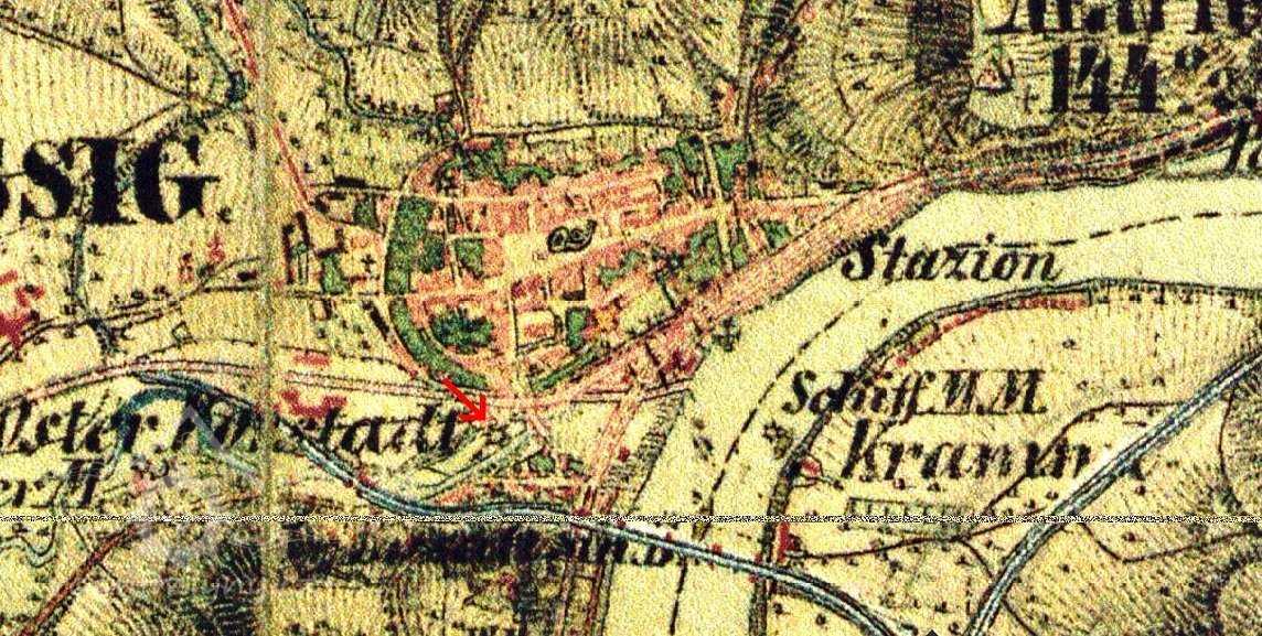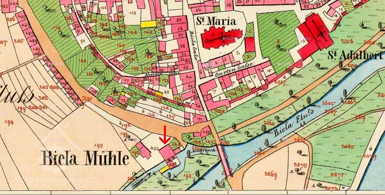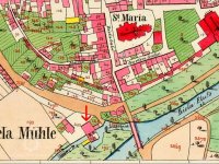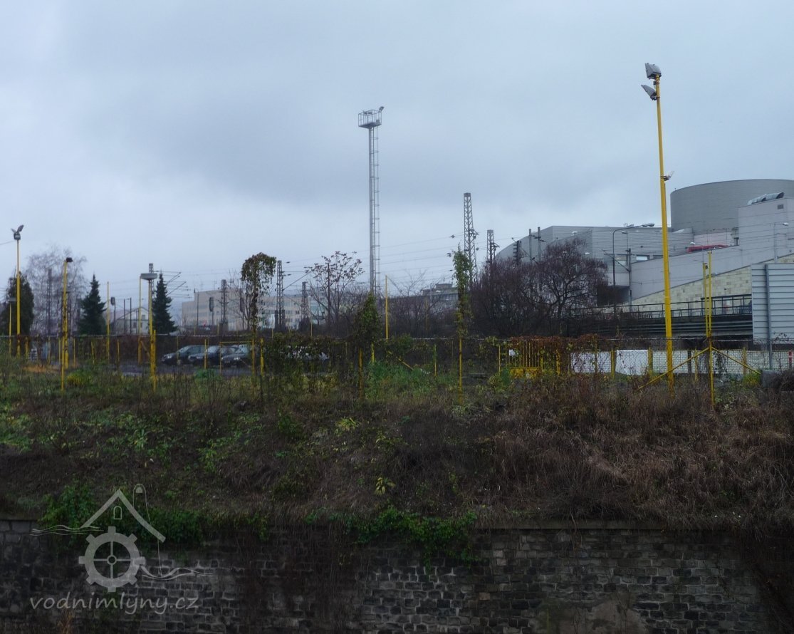 Mlýn stál na zaniklém ostrově. okolí mlýna se zcela změnilo po bombardování města na jaře 1945. V současnosti je na místě, kde slál mlýn, parkoviště.(HŠ)