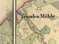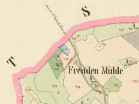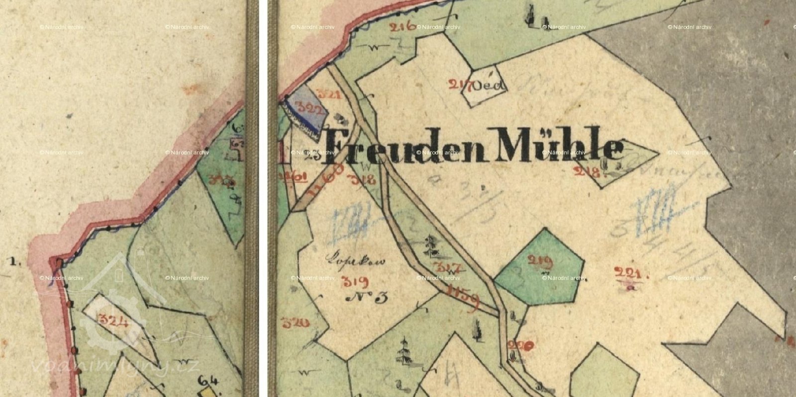 Výňatky z protokolu z 5. října 1881: "Komise sestoupivší se v mlýně samém, odebrala se na místo šetření a shledala, že mlýn - přízemkové to stavení dřevěné na kamenném spodku, šindelem kryté - je na levé, jižní straně vodovodu. Mlýn je zařízen na vrchní vodu a má jedno obyčejné složeni. Voda ku hnaní mlýnského stroje přichází z vrchu Kozákova, kdež vzniká v prameni zvaném Radostná. K zjištění nápadu (spadu) u mlýna toho vytesala se v kvádru rohovém v sedmé vrstvě zdi na severní straně budovy vodorovná rýha, a sice ve vodorovné výšce se středem čepu vodního kola, která byla vytesána a vyznačena dle připojeného obrazce. (V. K. 1881) Měřením se vyšetřilo následující: Dřevěný žlab je na začátku v nádržce 143 cm pod korunou hráze nádržky a leží 6,68 m nad rýhou - normálním znamením. Konec žlábku u kola 6,6 m, normální znamení leží 6,6 m nad půdou podkol. Obnáší tedy nápad mlýna toho 14,8 m. Na to přikročeno ku zjištění vodních práv tohoto mlýna, jež záleží dle výpovědi vlastníka mlýna, pak přítomného zástupce obce v nerušeném užívaní vody z pramene Radostné ku hnaní mlýna, pak ve vyklizení vodní strouhy bez odporu držitelů sousedních pozemků."