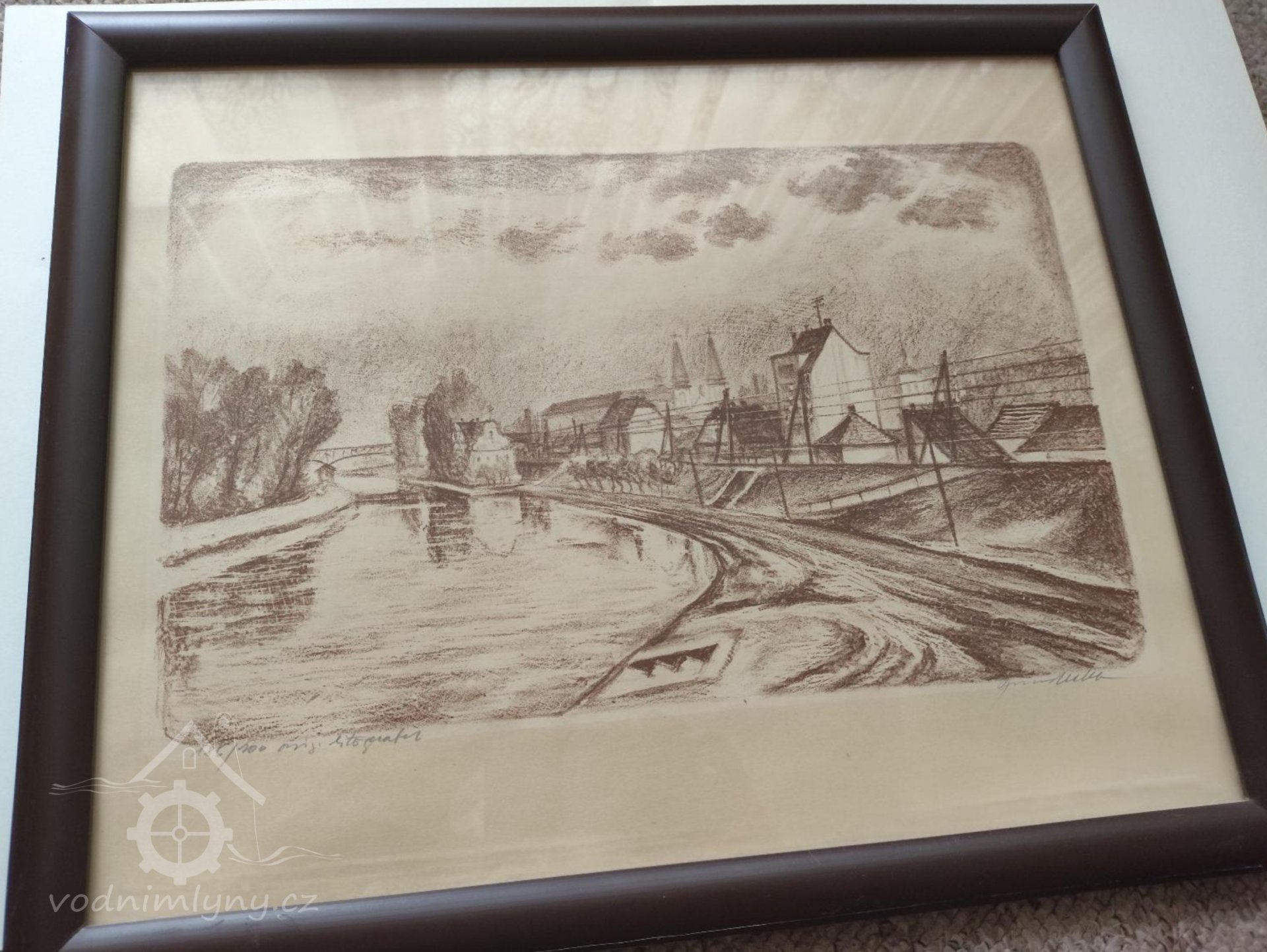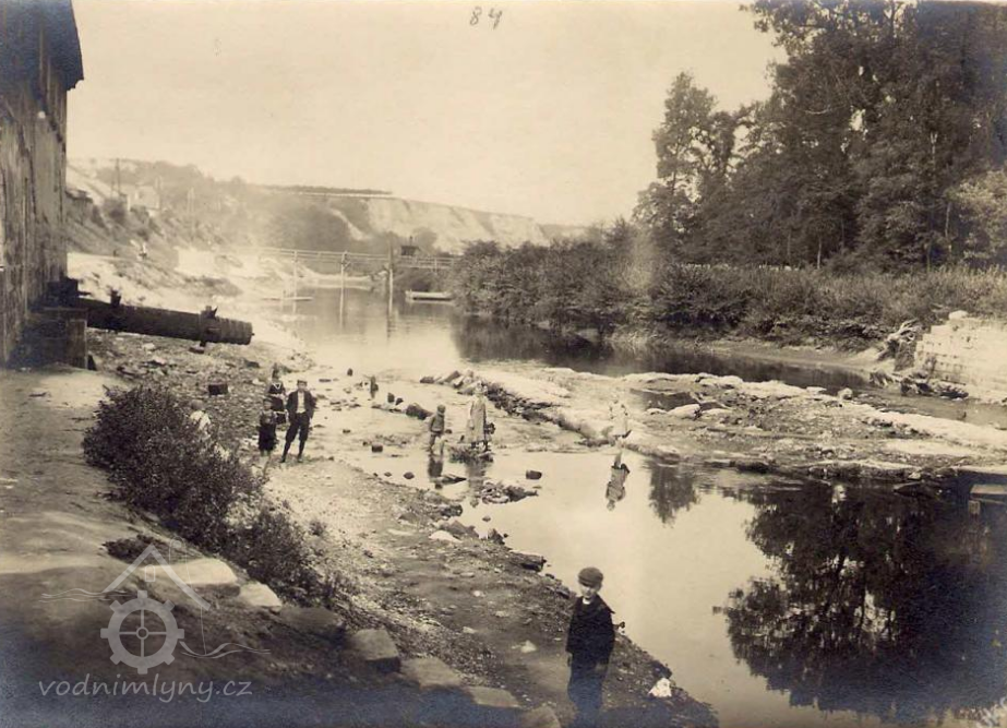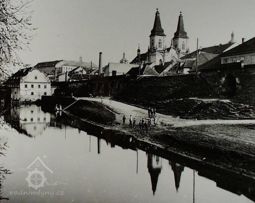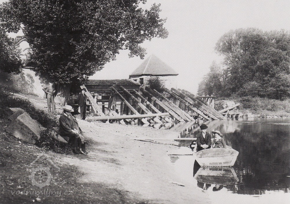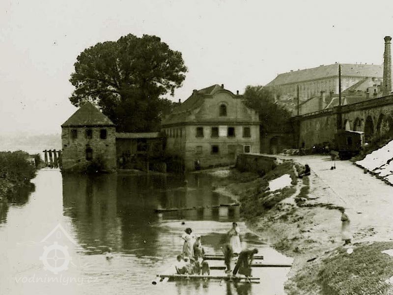 1874: mlýn stál naproti východní špičce knížecího ostrova, od kterého šikmo proti proudu zadržoval vodu dlouhý jez, ponechávaje lodím a vorům volný průchod u pravého břehu k Vědomicům. Tento náhon, stále se mělčící zanášeným bahnem, přiváděl vodu ke stavidlům mezi mlýnem a pilou, před nimiž se zvedala mohutná ochrana ledoborných dubových koz, zde zvaných kobyl. Šestero vysokých kol na spodní vodu pohánělo mlýnské stroje a pilu, odtud plynula tiše voda mezi břehem města a ostrovem.