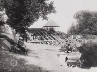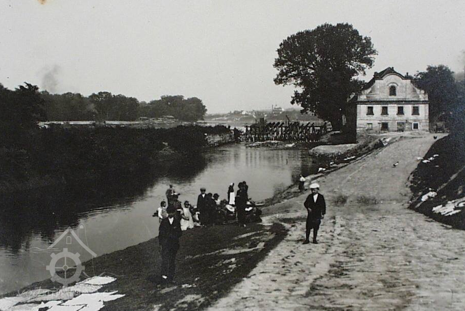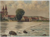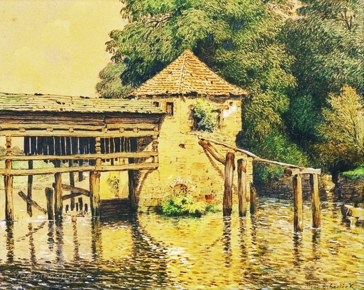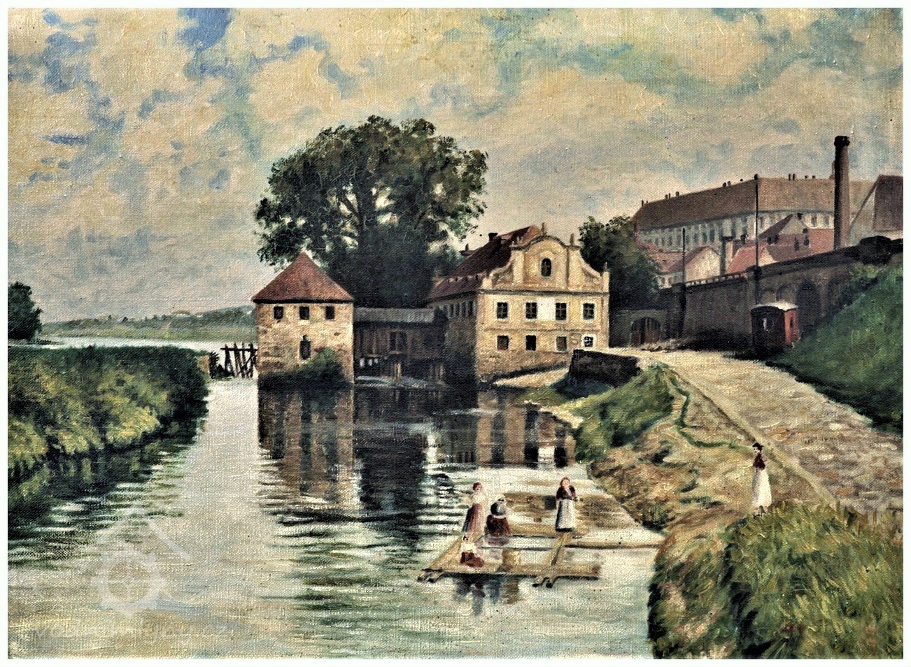 1874: mlýn stál naproti východní špičce knížecího ostrova, od kterého šikmo proti proudu zadržoval vodu dlouhý jez, ponechávaje lodím a vorům volný průchod u pravého břehu k Vědomicům. Tento náhon, stále se mělčící zanášeným bahnem, přiváděl vodu ke stavidlům mezi mlýnem a pilou, před nimiž se zvedala mohutná ochrana ledoborných dubových koz, zde zvaných kobyl. Šestero vysokých kol na spodní vodu pohánělo mlýnské stroje a pilu, odtud plynula tiše voda mezi břehem města a ostrovem.
