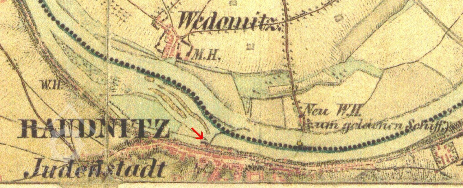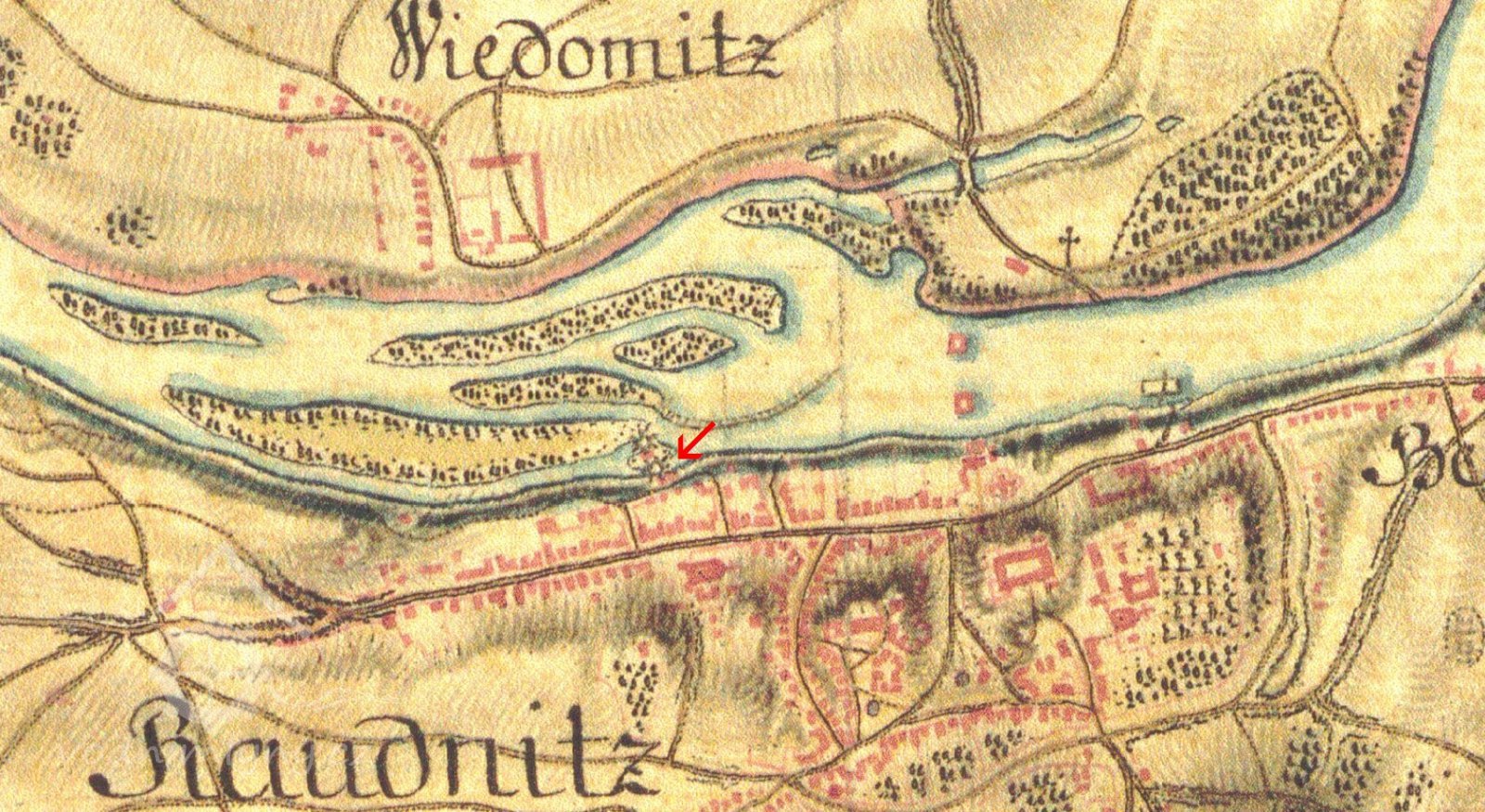 Součástí mlýna byla zřejmě od samého počátku také pila, která se nacházela na ostrově na protějším břehu labského ramene.