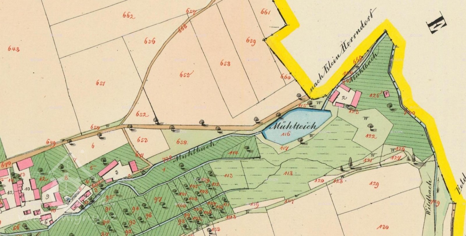 Nad mlýnem je rybník, Čermačka, přebudovaný na nádrž pro potřeby nedalekého zahradnictví
