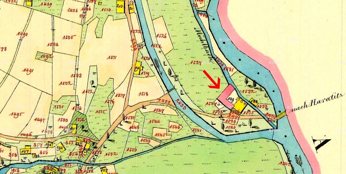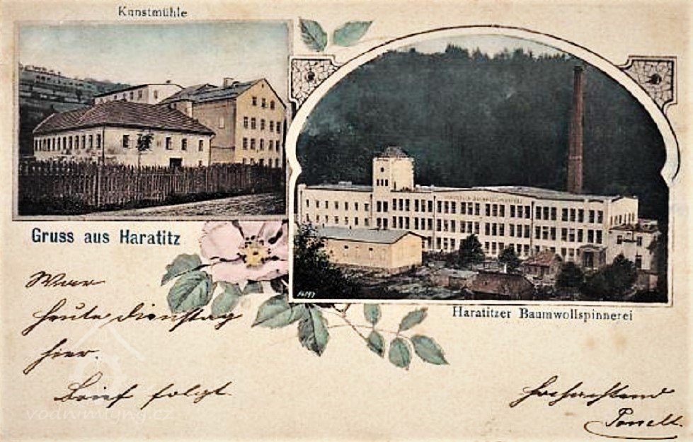 31.1.1733 panský mlýn haratický s pilou odevzdán dědičně Václavu Palmovi, poddanému jilemnickému za 1.200 zl. se všemi pozemky, jak jich užíval předchozí (nejmenovaný) mlynář