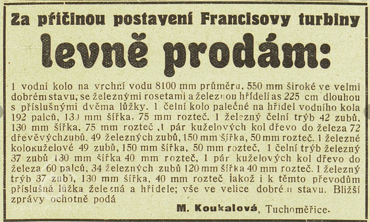r. 1930 - majitelka Marie Koukalová, uveden motorový mlýn a výroba el. energie