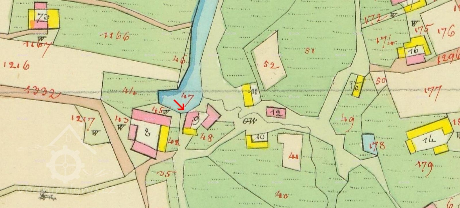 „ Mlýn má jedno české složení tři stoupy, jenž vše pohání se dvěma vodními koly. Vodní kolo mlýnské má 1,5 m v průměru a 67 cm šířky, stupní kolo vodní má v průměru 1,3 m a šířky 60 cm. Na mlýn hradí se voda v potoce stavidlem o rozměrech 40 cm do čtverce a přivádí se do mlýnské nádržky č.parc. 47. Z nádržky táhne se voda do dvou žlabů troubami se stavidly; stavidlo před troubou vedoucí vodu na mlýn jest 37 cm vysoké a 32 cm široké, stavidlo před troubou vedoucí vodu na stoupy má rozměry 20/10 cm. Mlýnský žlab je 23 cm široký a 27 cm vysoký, stupní žlab má rozměry 20/20 cm. Pro jalovou vodu je v nádržce stavidlo 1 m vysoké a 1 m široké. Obě kola vodní jsou na vrchní vodu. (Zapsáno na základě přihlášky pro zápis do vodní knihy č.8812).“