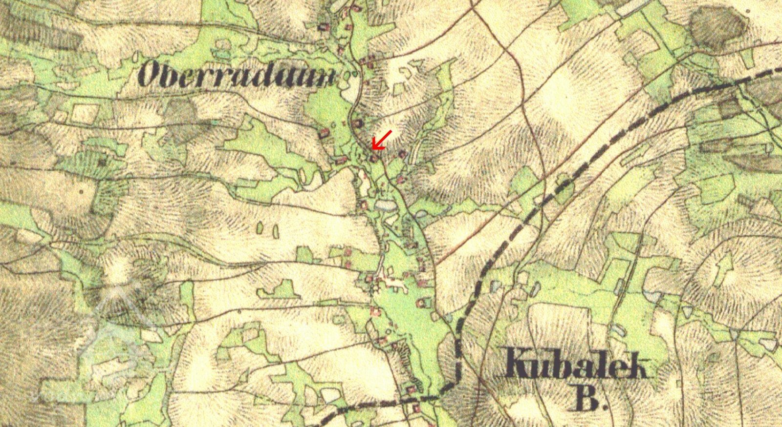 Místní obec Horní Radouň, osada Horní Radouň, na potoce od Bozděchova přicházejícím, mlýn čp.60 se stoupami. Držitelé: Františka Nedbalová, Jan Hrstka, dle sdělení c.k. okres. Soudu v Kamenici n.L. z 3.1.1902 jsou knihovními držiteli Jakub a Rosalie Šrůcovi