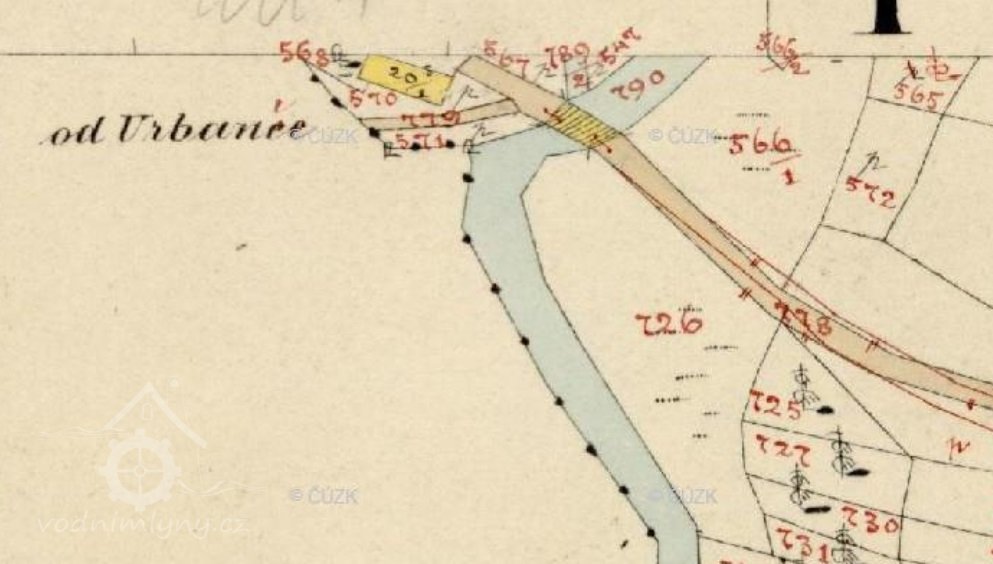 Popis1930: 3 kola na spodní vodu, hltnost 0,754 m3/s, spád 2 m, výkon 5,8 HP