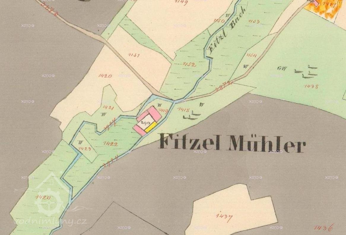 1599 - mlýn uváděn jako Ficl nebo dokonce Fencl (možná souvisí se jménem Fixl). Publikace Kůrka Karel, Trhové Sviny : historický nástin do poloviny století XIX., Trhové Sviny 1936, s. 23 uvádí krátký popis "svinenského mlýna" a zmínku o Fitzlově mlýnu. Není ze smyslu jisté, zda se jedná o stejné objekty. Popis je v rámci sumáře rychtářství, uvedeme jeho doslovné znění :