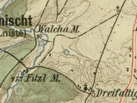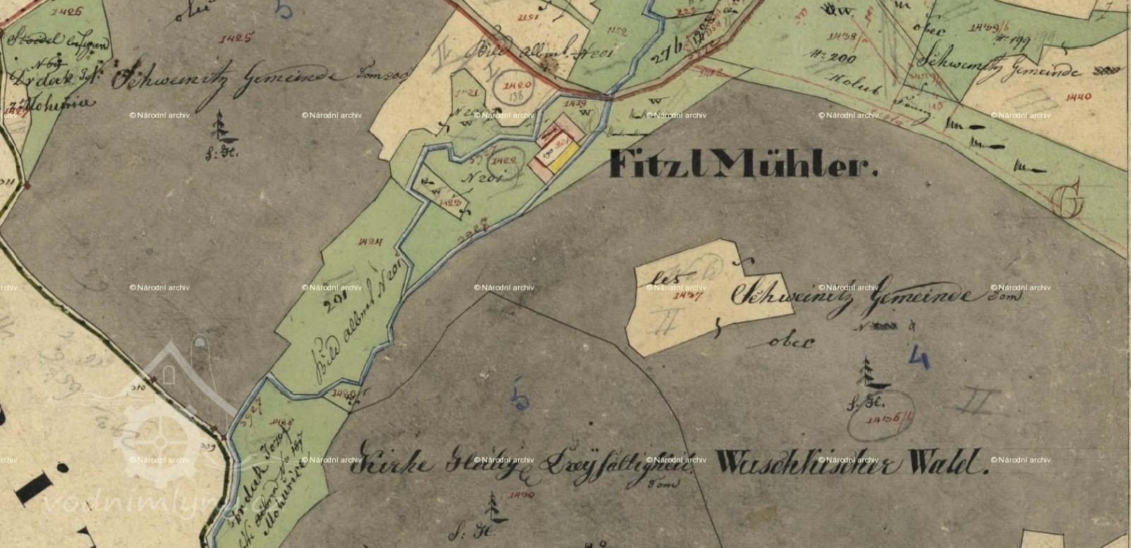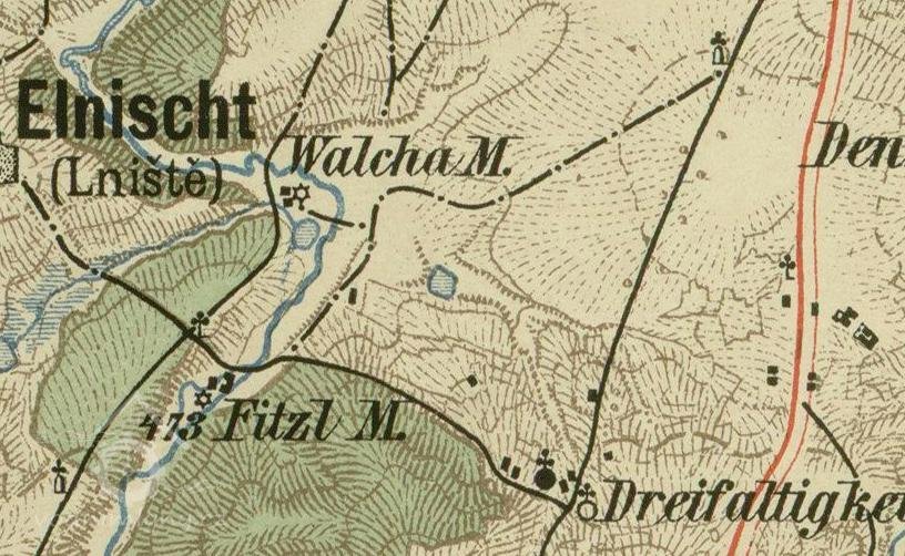 Je zajímavé, že tehdy cesta odbočovala pouze doprava na Lniště (Elnischt). Kolem mlýna se rozkládalo několik pastvin (W = Weiden). Není zde vyznačena jakákoliv příjezdová cesta (tedy myšleno odbočka z polní cesty od Svinů, která je na otisku značena).