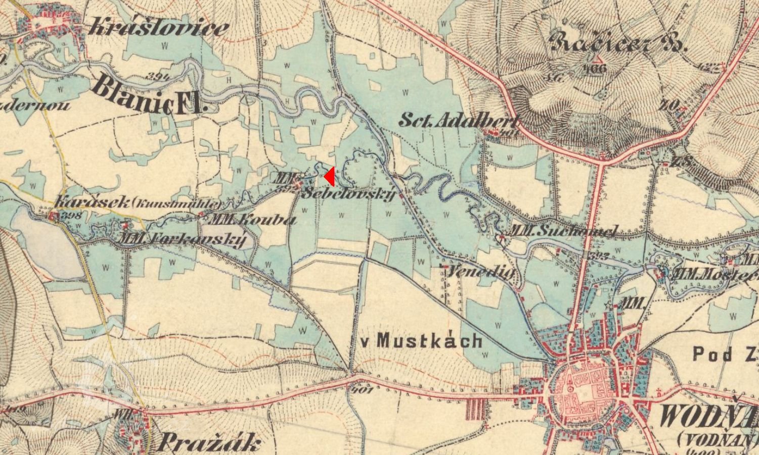 23.8.1758 podkomořský úřad přiklepl mlýn Šebelemu po složení 600 zl., musel se zavázat, že mlýn opraví na vlastní náklady. Mele pro obyvatele města, poddané ze dvora Pražáku a opě pro poddané ze Stožic, kteří zde musí mlít povinně. Při prodeji do cizích rukou má město předkupní právo. Obec zde dle požárního řádu zanechla 1 žebřík a 2 džbery na vodu.