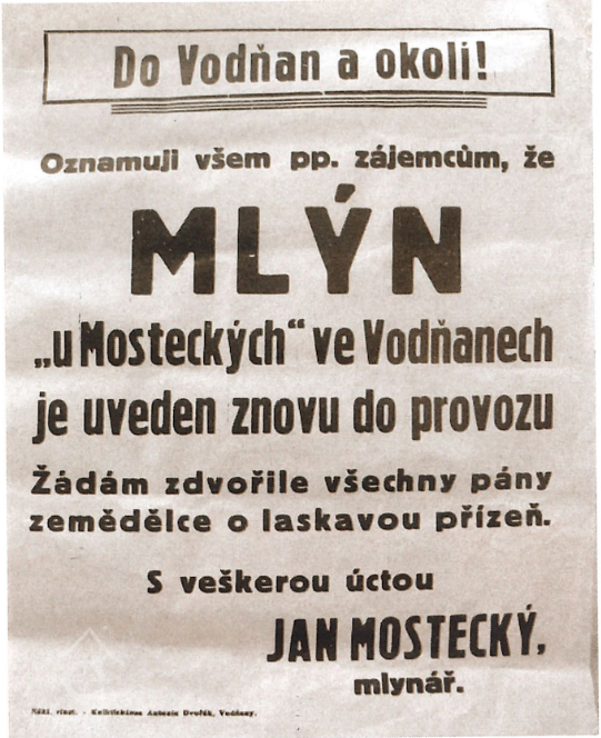 29.9.1865 Josef Mostecký zemřel, mlýn převzal syn Jan Mostecký (1843-1912), 1867 se oženil s Johanou, dc. Josefa Žahoura z Kulhánkova mlýna