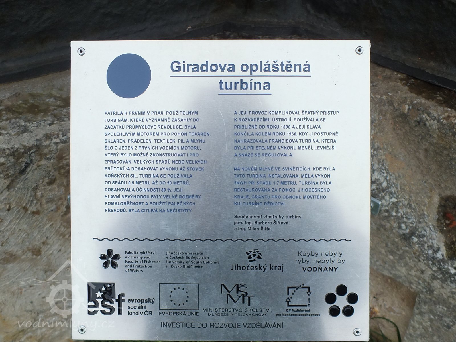 Dochována turbína systému Haag (zde nesprávně označovaná jako Girard), používaná v poslední čtvrtině 19. stol. hlavně v USA, jedna z předchůdců turbiny Leffel - Francis. Jedná se o velmi vzácnou a hodnotnou historickou vodní turbínu, v ČR je pravděpodobně jediná. - David Veverka