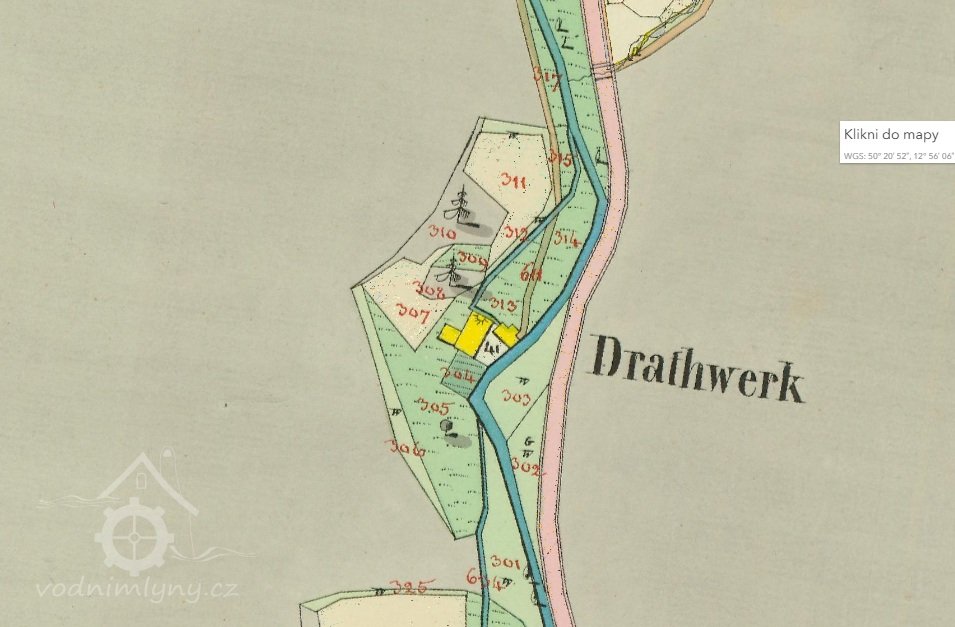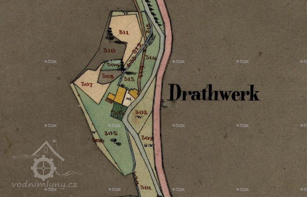 Na mapě Chebského kraje z roku 1715 je mlýn ještě označen jako obilný mlýn. Na mapě z roku 1742 Thermas Carolinas je již mlýn označen jako drátovna s odlišným symbolem mlýnského kola. V kronice města se zhruba do roku 1720 hovoří o mlýnech. Po tomto datu již kronika výslovně hovoří o mlýnech, papírnách, drátovnách. Jinak tento mlýn společně s dalšími v oblasti zvané Mühlengrünn (později Mühlenthal) patřil společně s Horním Žďárem městu Jáchymov.