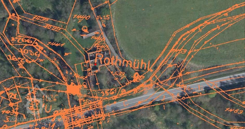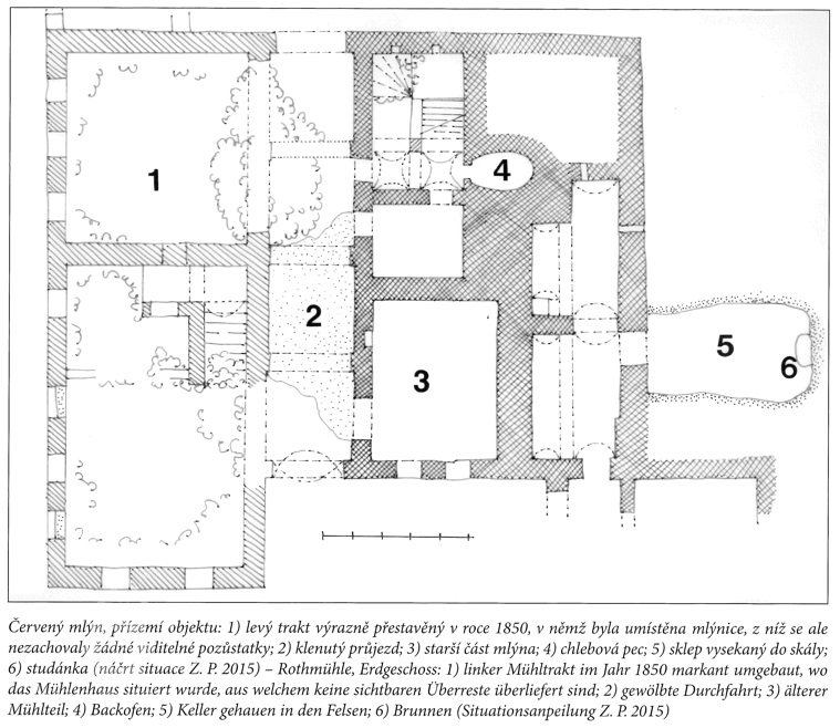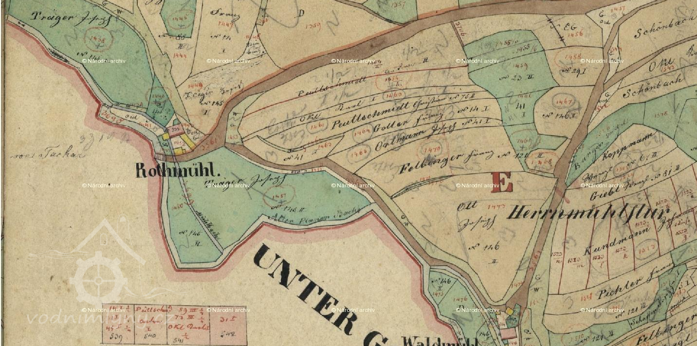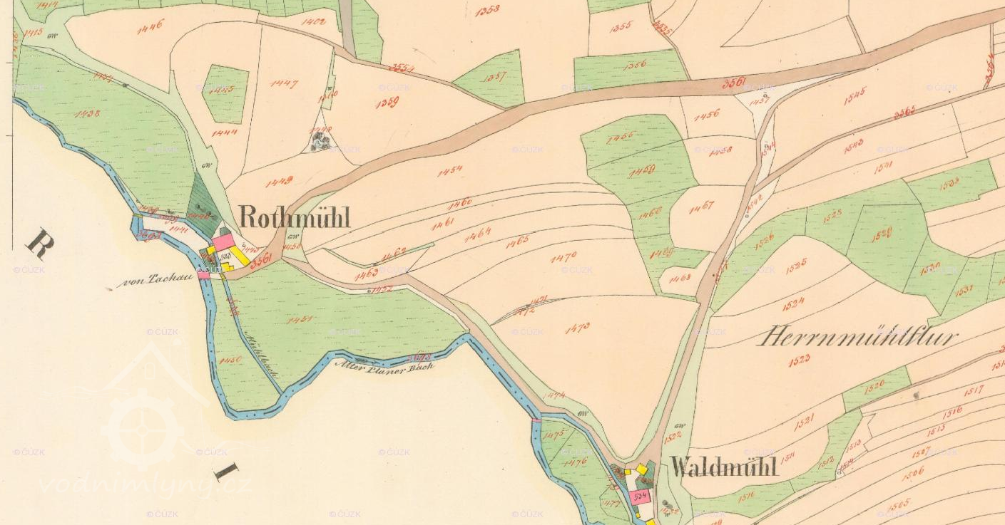1656 jeden ze tří plánských mlýnů (Rothmühle, Schladamühle a Waldmühle)