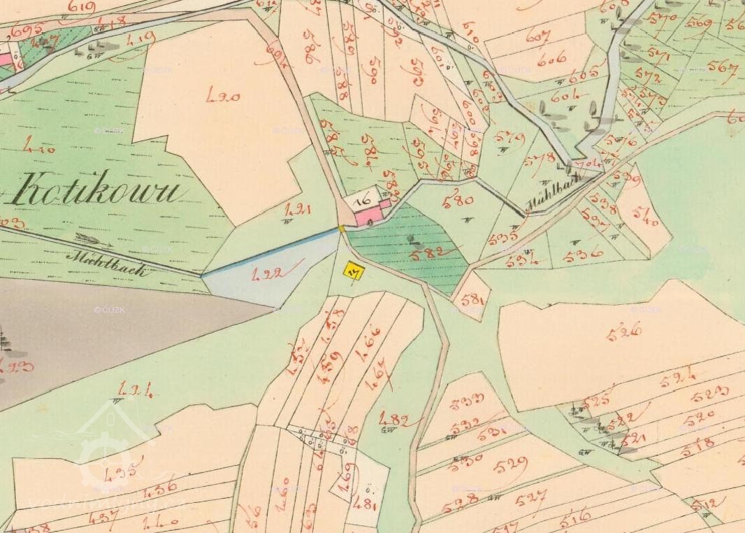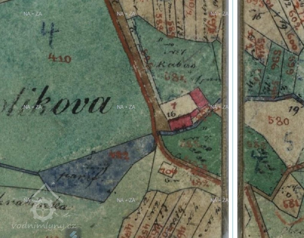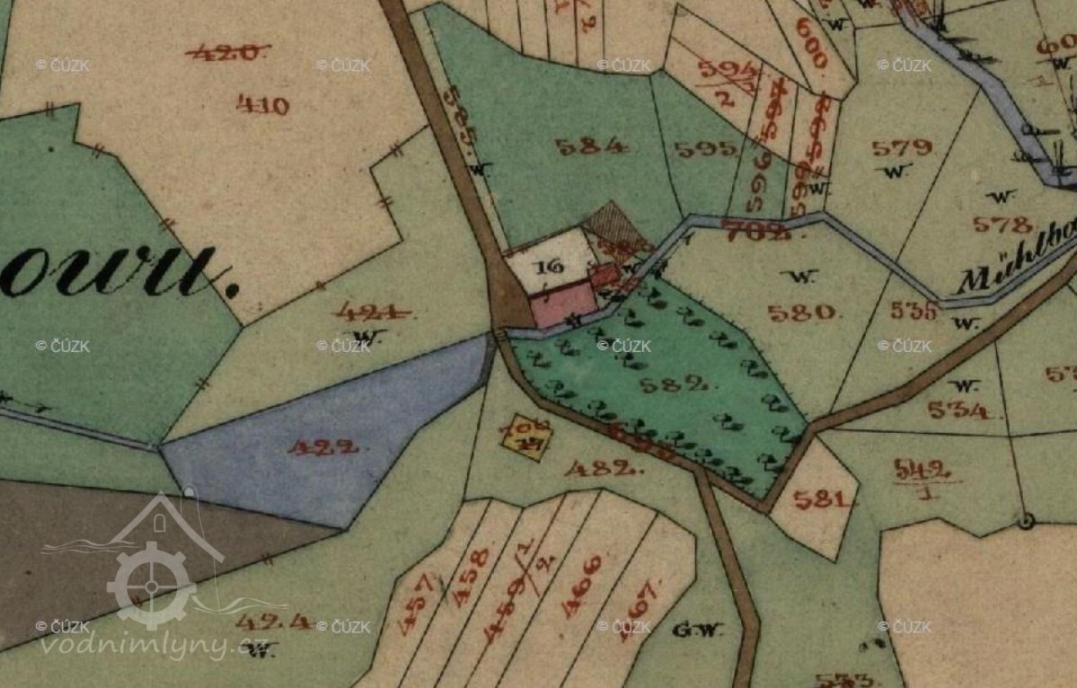 V roce 1886 k mlýnu přináleží kromě náhonu i nádrž o rozloze 422 čtverečních sáhů (cca 1523 m2).