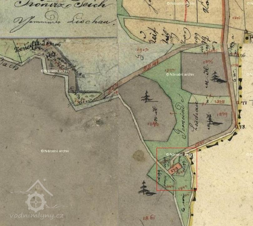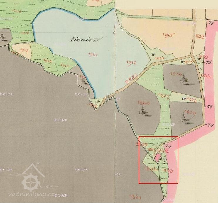 Stav konec roku 1930 - mlýn napájen z rybníka Koníře, Lišov čp. 199, majitelka Růžena Reifová.