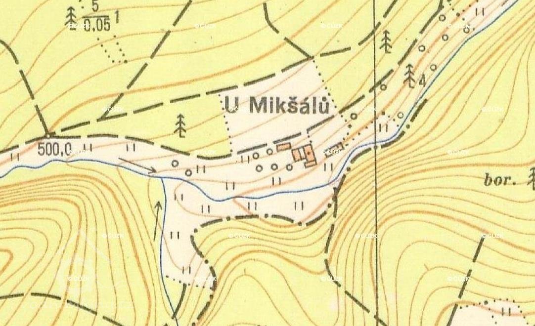 Mlýn na Besednickém/Keblanském potoce mezi Nesmění a Keblany v lokalitě zvané "U Mikšálů" (čp. 51, cca. 2km východně Nesměně).