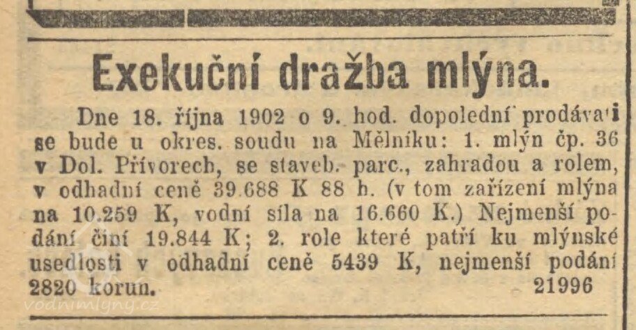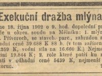 1883 "mlýn v Dolních Přívorách, blízko Železniční¨satnice Všetaty - Přívory na Košáteckém potoce, s 13 korcí polí, na prodej