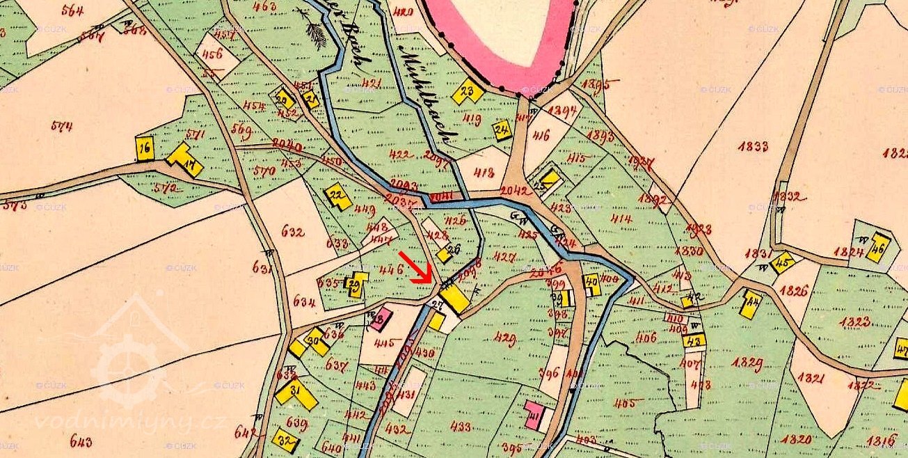Mlýn se nachází již ve 40tých letech 19. století na mapách stabilního katastru. Roku 1862 mlýn kupuje Jan Kovář v zastoupení otce Pavla z Křížlic. Jednalo se dědické řízení po zemřelém mlynáři z Mříčné, Michalu Plamínkovi. Ještě roku 1877 byl mlýn v držení Jana Kováře. (PŠ)