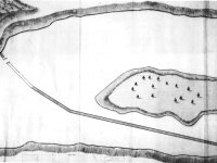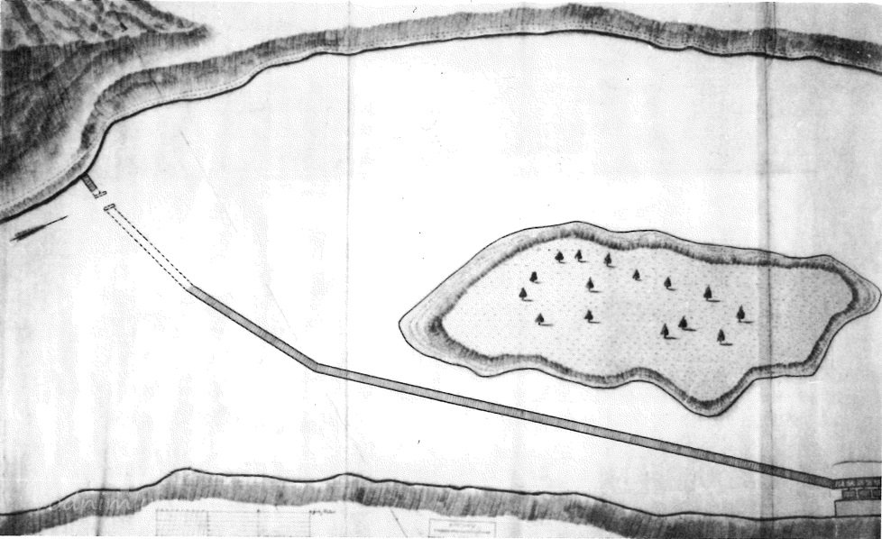 Jez směřoval šikmo proti proudu k levému břehu, protínal několik ostrůvků