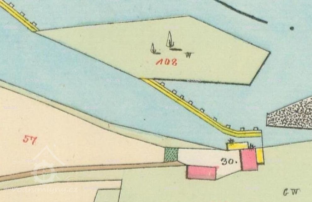 Popis1930: 2 kola na spodní vodu, hltnost 3,83 m3/s, spád 1,75 m, výkon 26,4 HP, kolo pro mlýn prům. 6,2 m, kolo pro pilu prům. 7,8 m