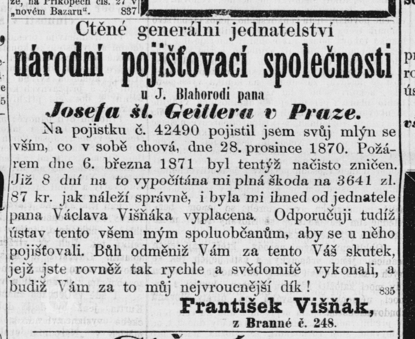 6. března 1871 mlýn vyhořel. Rok předtím byl pojištěn.