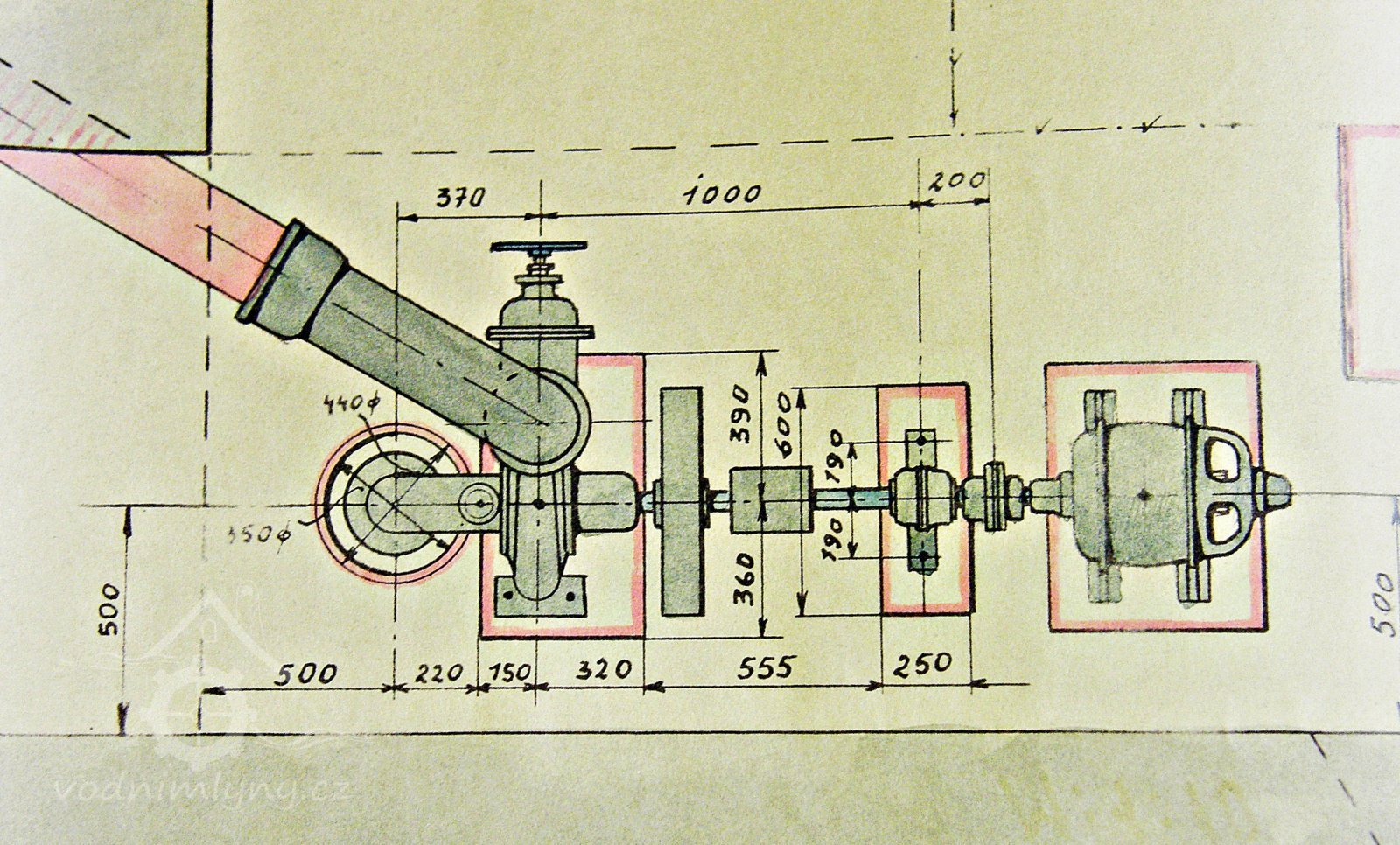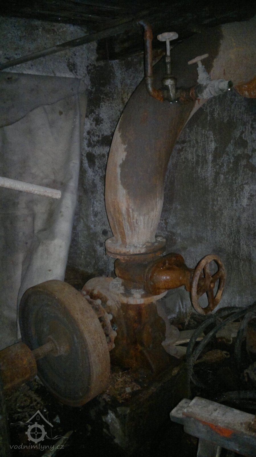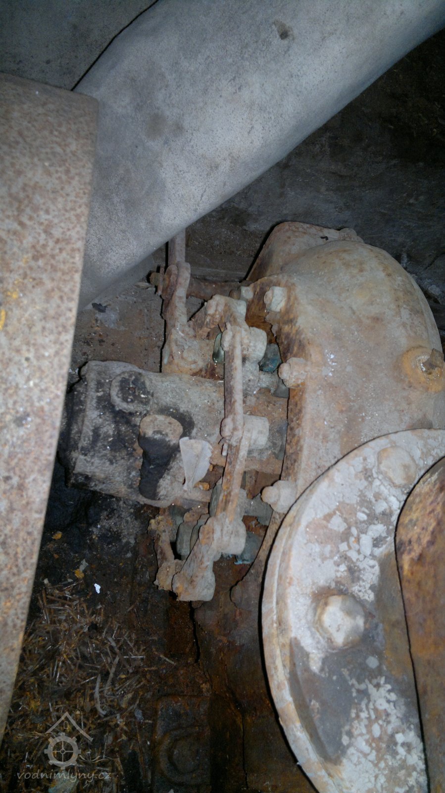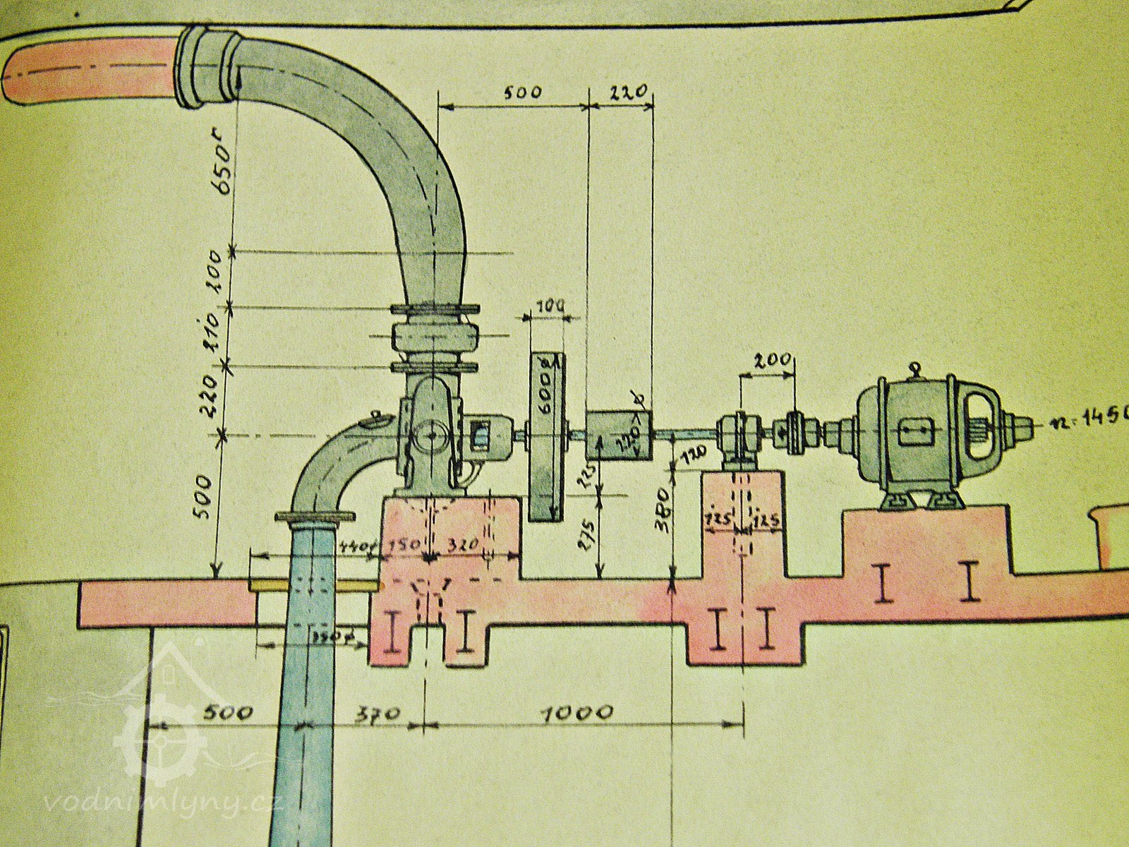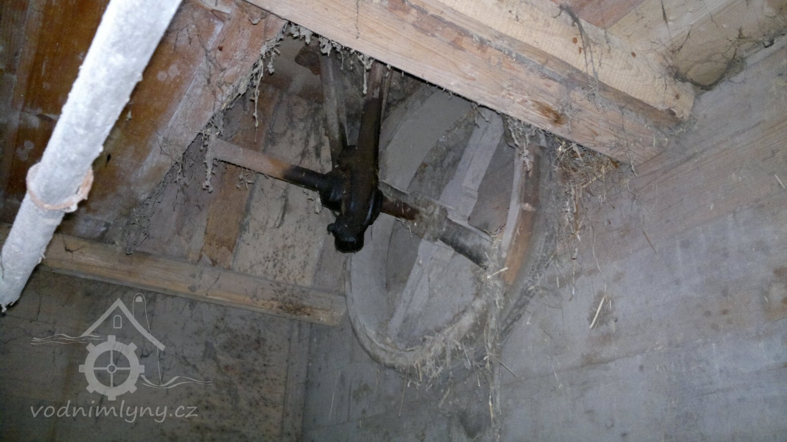 PopisMalá Francisova spirální turbina s horizontální hřídelí a setrvačníkem.