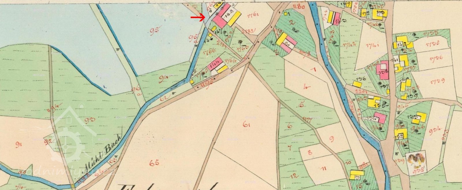 cesta vody ke mlýnu- 2,3 km dlouhý náhon kde před mlýnem vcházel do cca 100 m dlouhých vantroků o šíři 3 m dodnes patrné piloty ve dně mlýnského rybníku, který vznikl v 19 stol.