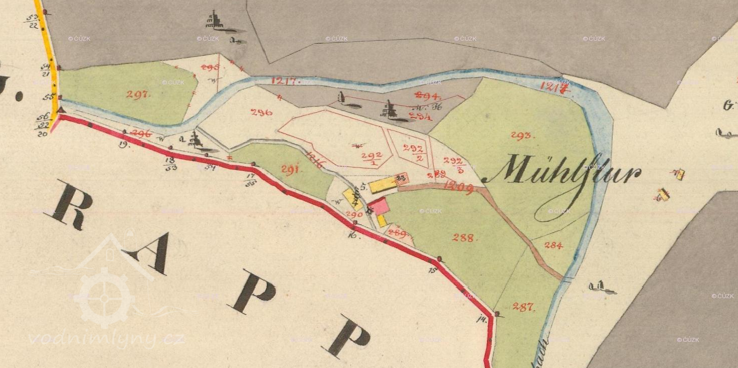 PopisV roce 1930 mlýn a pilu poháněla 2 kola na svrchní vodu, průtok 0.29 m3/s, spád 4.2 m, výkon 10 HP