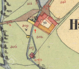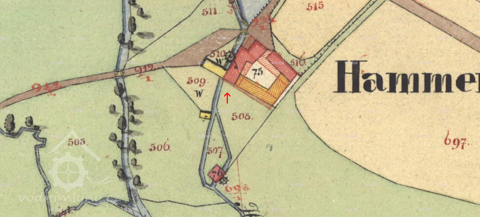 Hamr mlýn a pila při soutoku potoku Olšina a Špičák , stavení č.p. 1 a 2 , patřící rodině Riedl a Koller .
