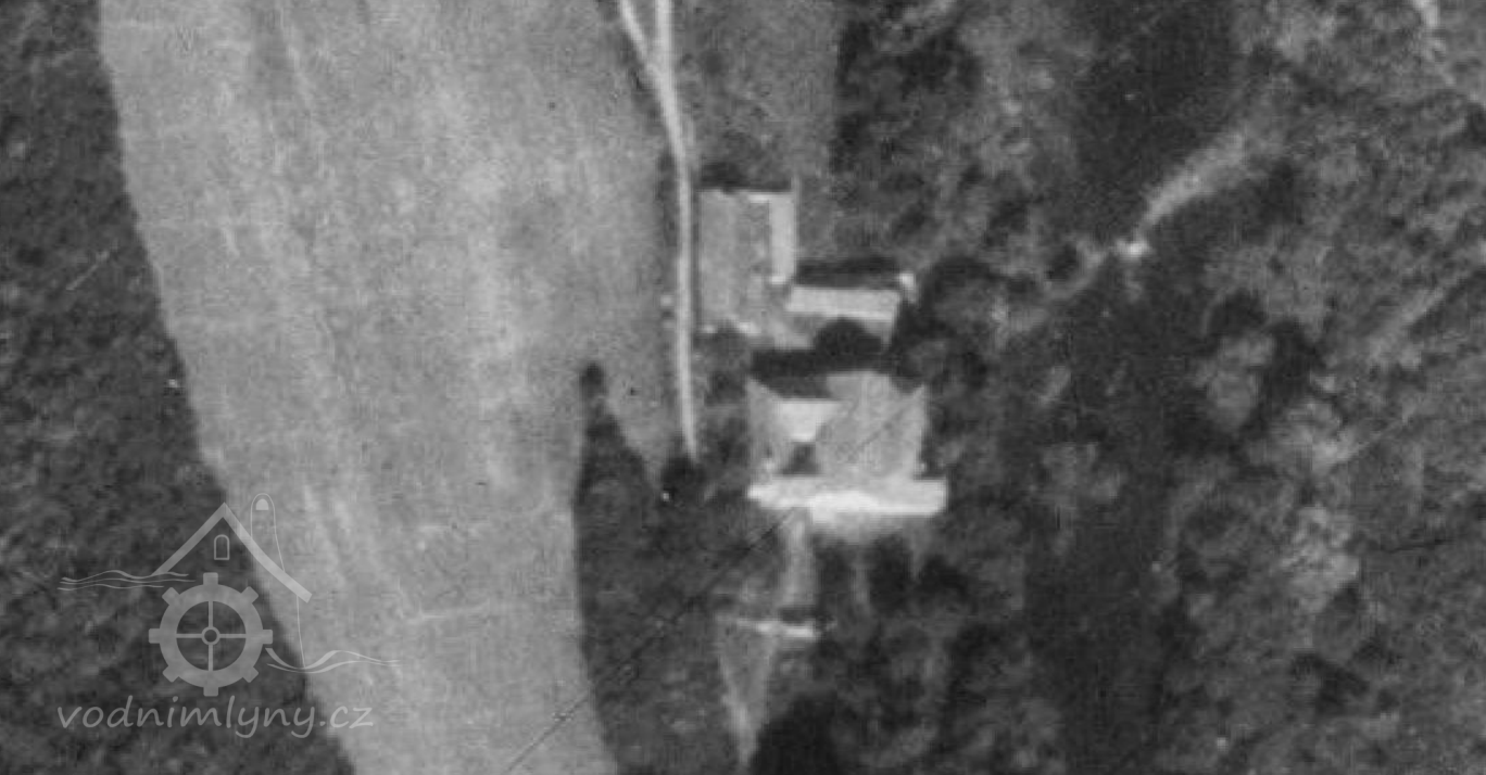 Na leteckém snímku z roku 1952 je mlýn zachycen ještě nepoškozen, zanikl tak až v následujících letech. (LR)
