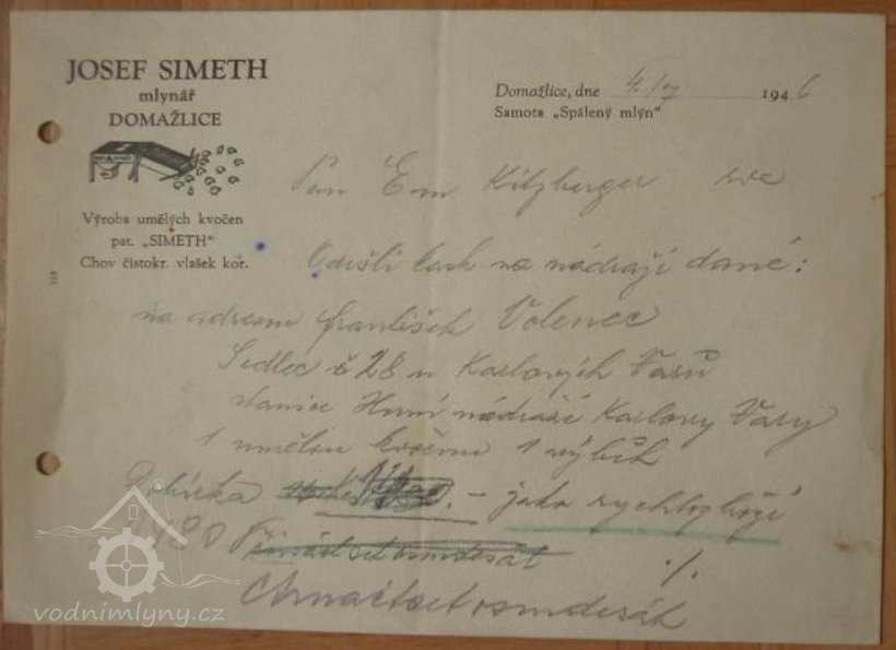 1919 - mlýn vyženil Josef Simeth (*1891) z Chodské Lhoty, který si vzal Anežku Holubovou (*1900) (JV)