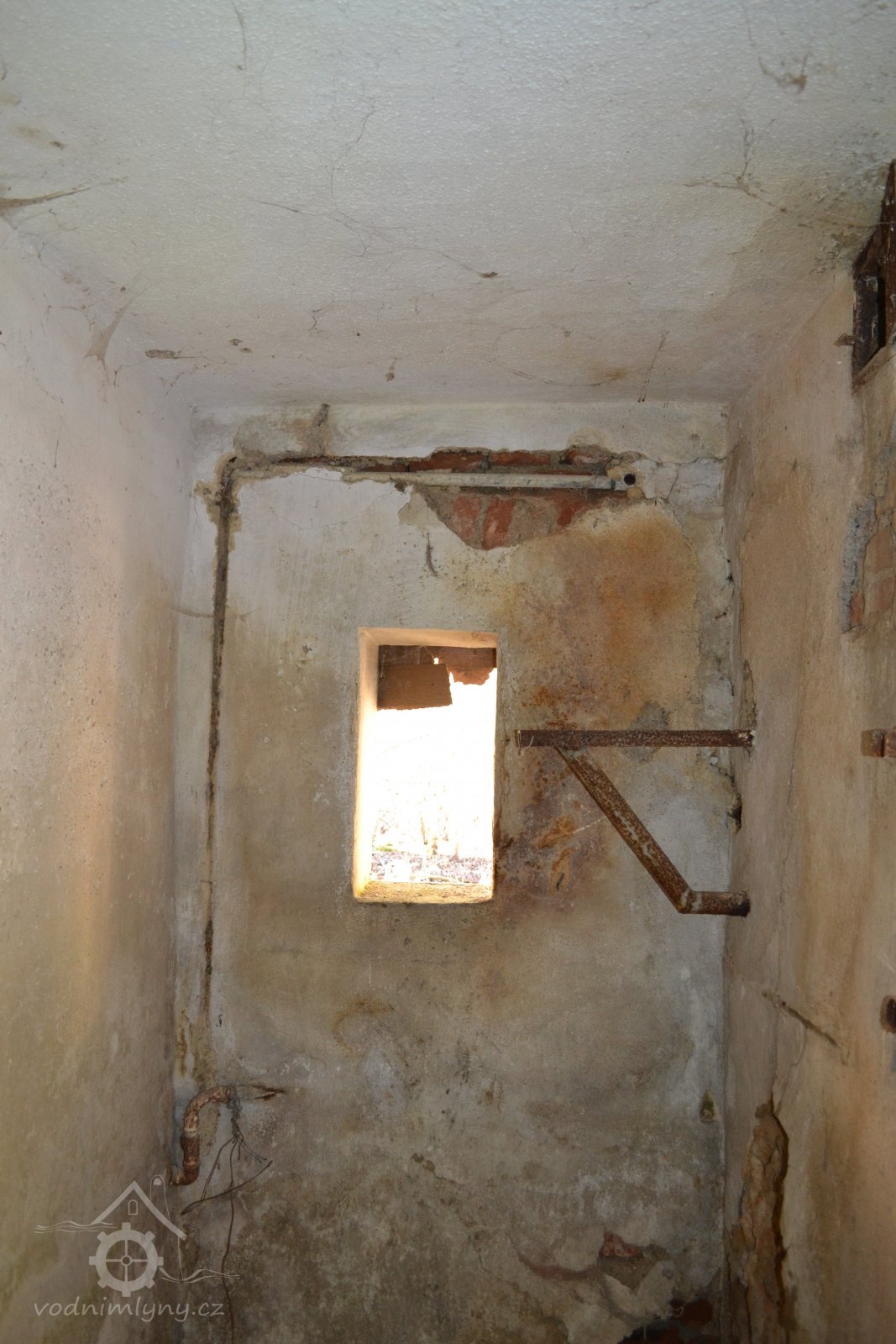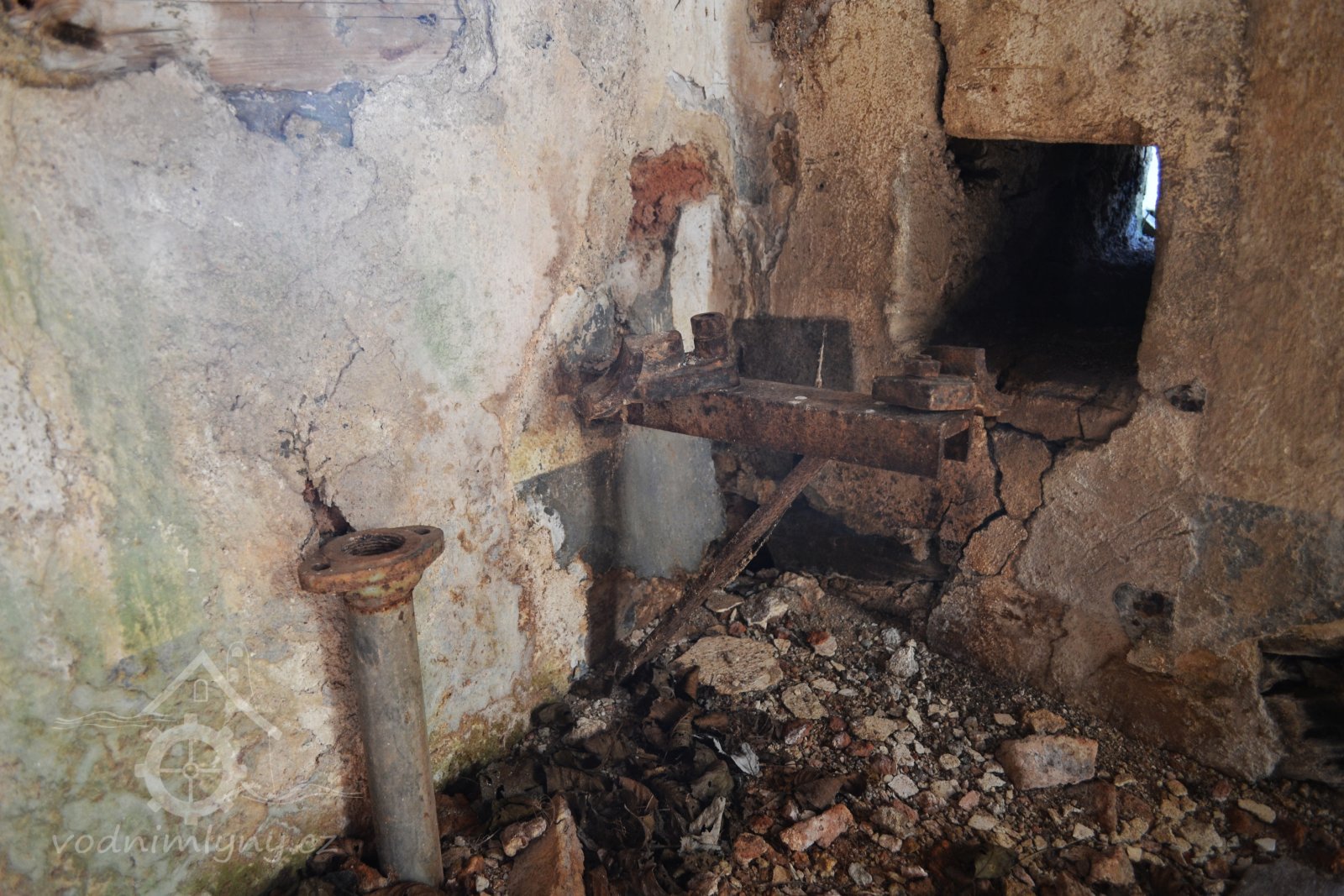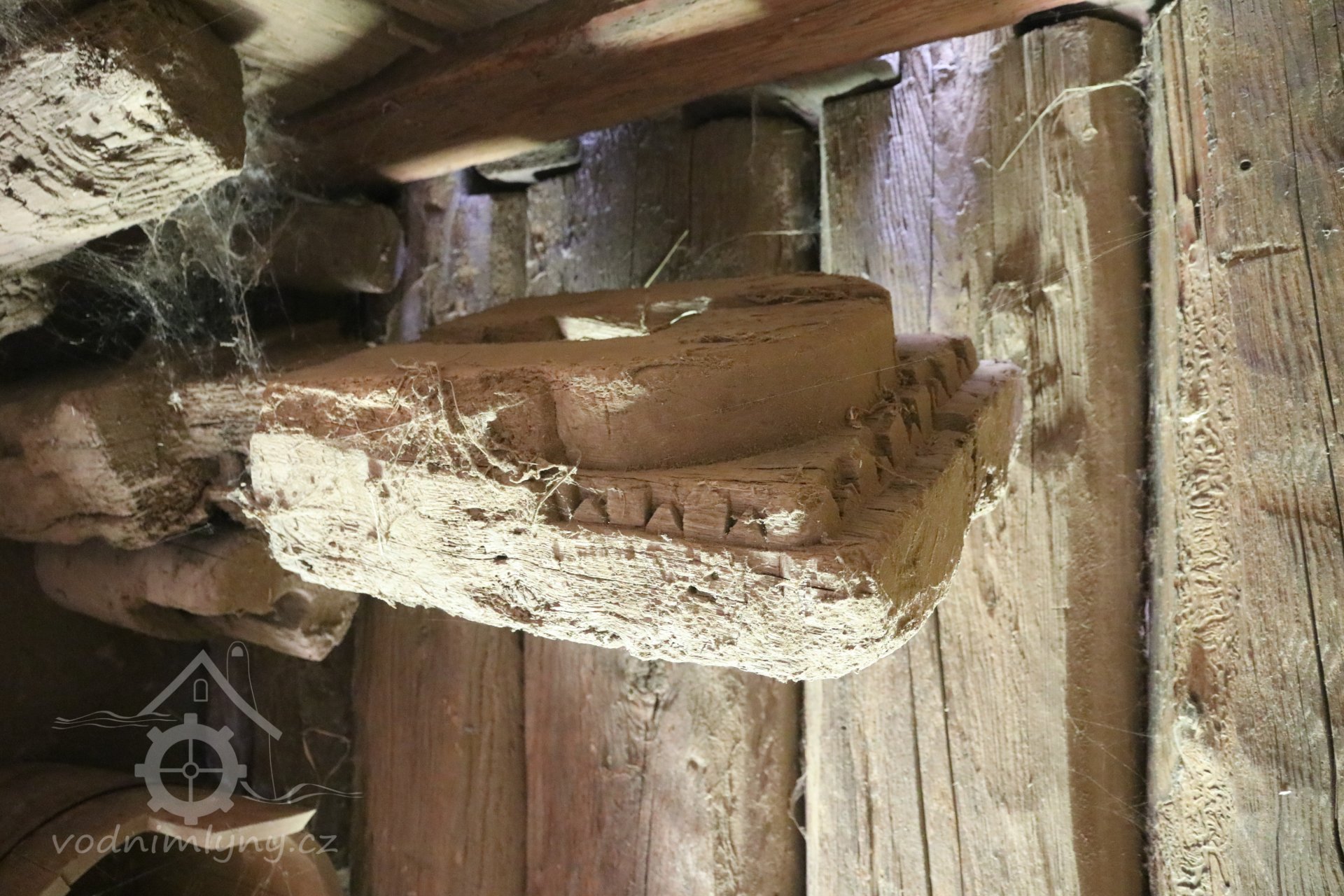 vodní síla přenášena z hřídele turbíny řemenem na hlavní transmisi, umístěnou ve mlýnici