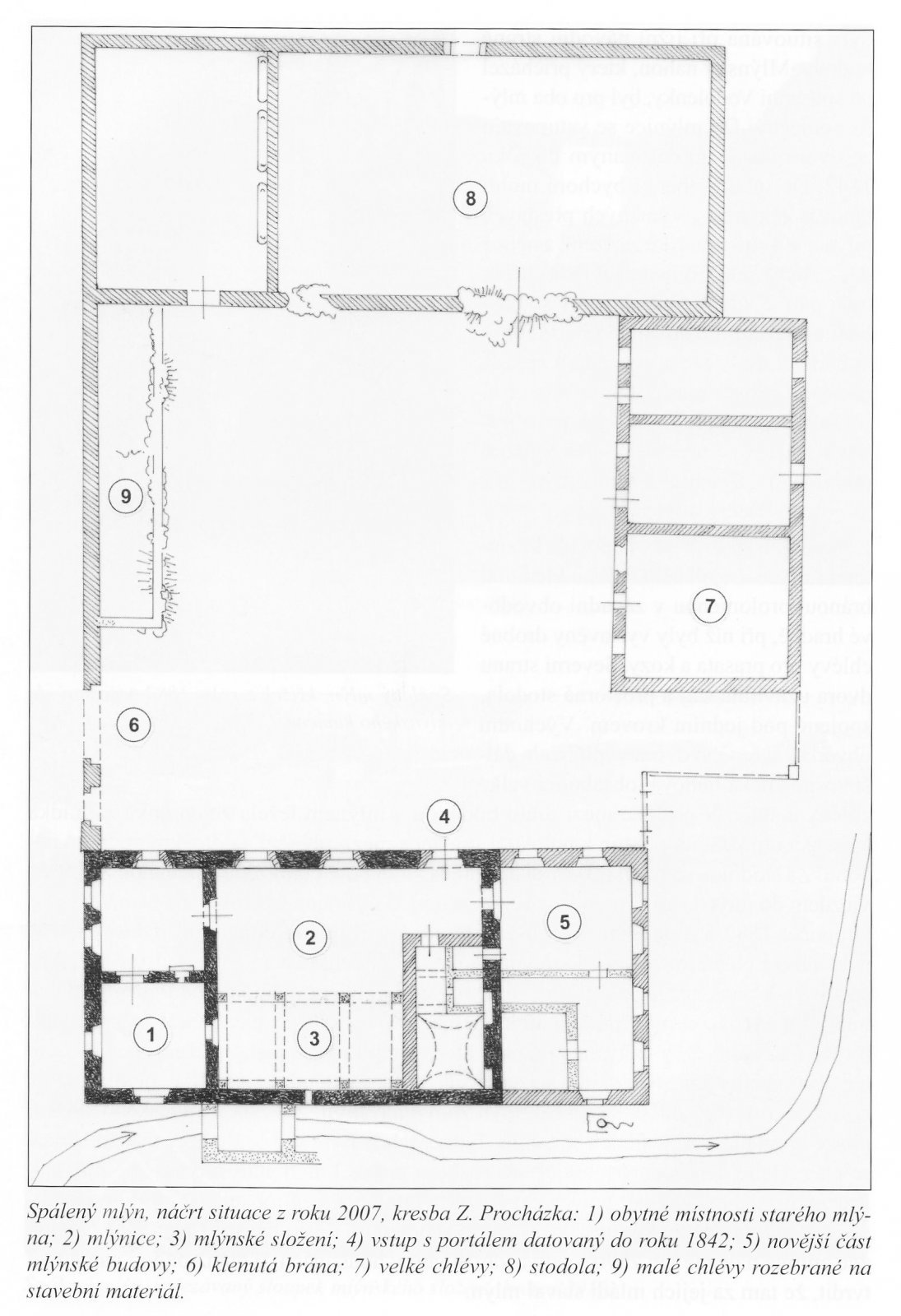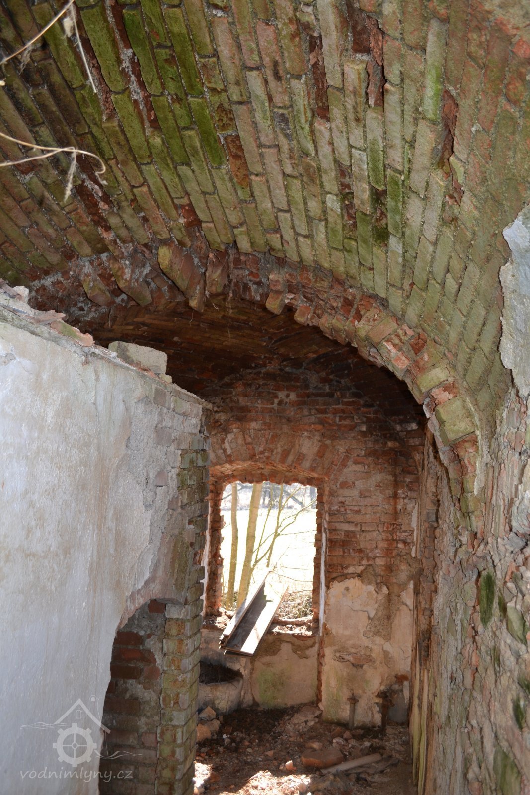 Mlýnice v jižní části areálu. Vystavěna ve dvou základních stavebních fázích. Starší západní část obsahovala 2 obytné místnosti, obrácené okny k příjezdové komunikaci, a mlýnici s lednicí, která byla situována na jižní návodní straně budovy. Do mlýnice se vstupovalo ze dvora portálem datovaným 1842 (přestavba mlýna). Snad právě v souvislosti s osazením datovaného portálu byla budova rozšířena k východu a získala tak další prostornou obytnou místnost. Mlýn byl přízemní, vysoký krov obsahoval další 2 úrovně podlah, využité pro mlýnské zařízení a též pro ubytování mlýnské chasy.