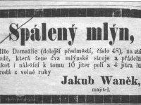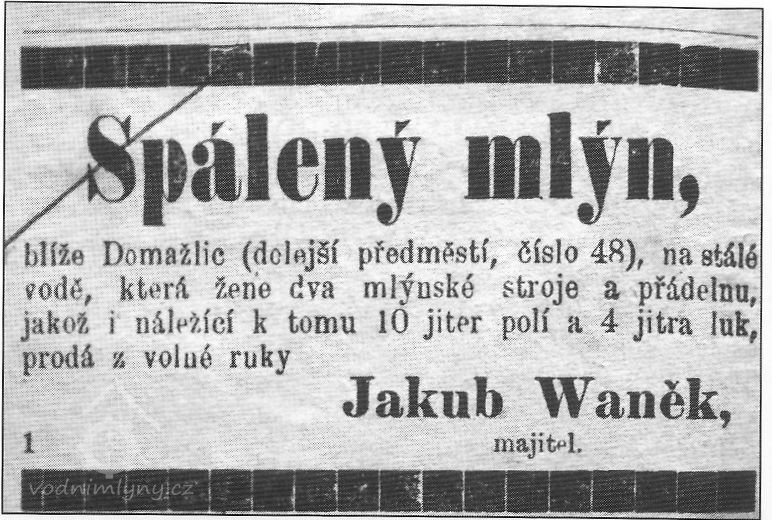 15.11.1884 - se snaží Jakub Vaněk prodat mlýn (viz inzerát v ikonografii) (JV)  U mlýna 10 jiter polí a 4 jitra luk.