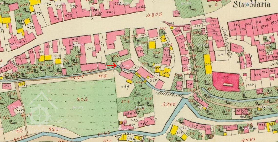 Vodní cejch byl osazen 9. 8. 1878, mlýn tehdy patřil Karlu a Markétě Regálovým a jeho dvě česká složení poháněla dvě kola o průměru 3.94 m.
