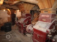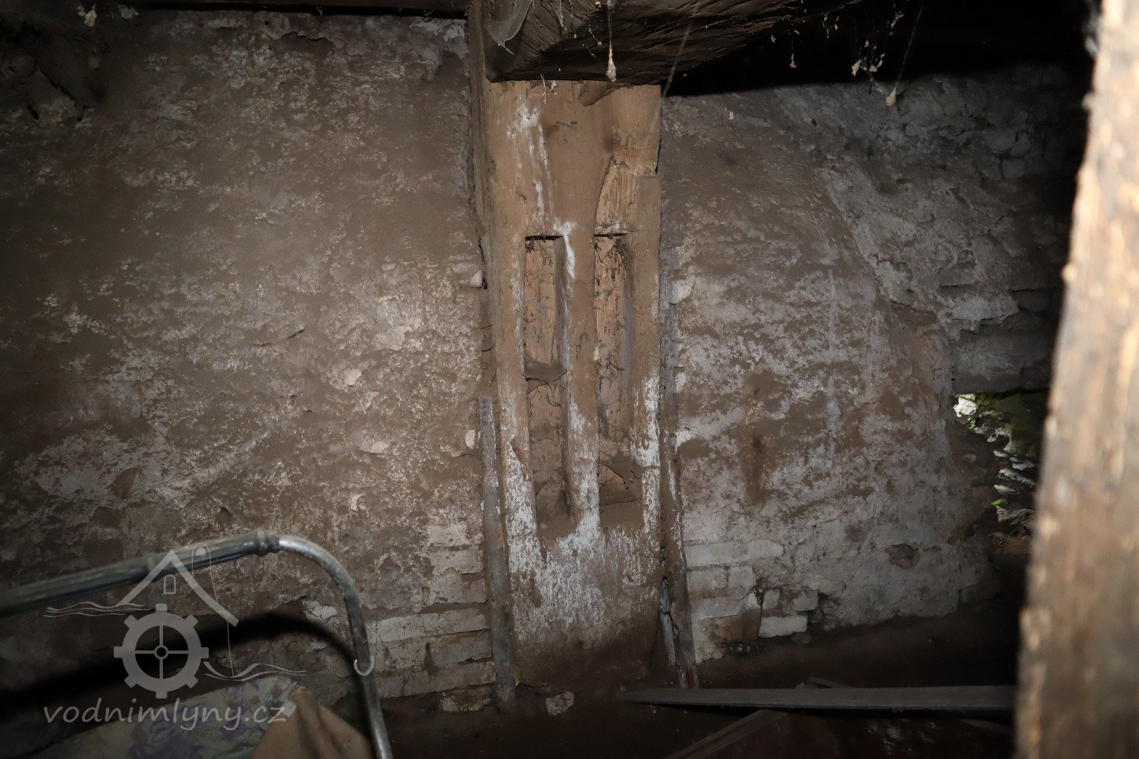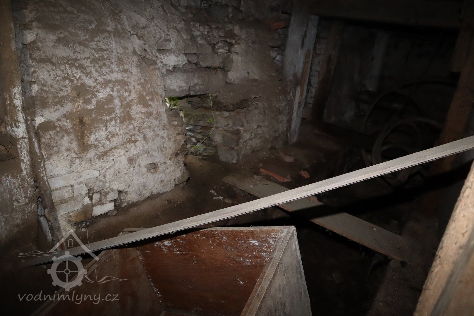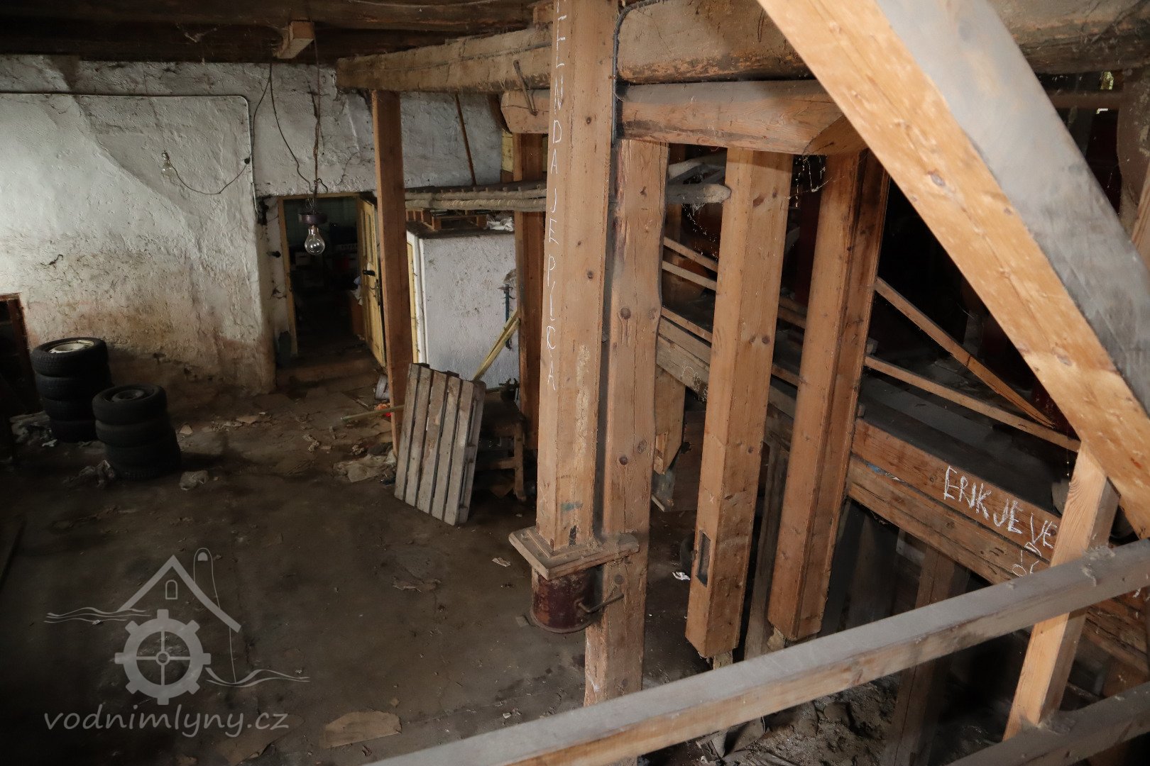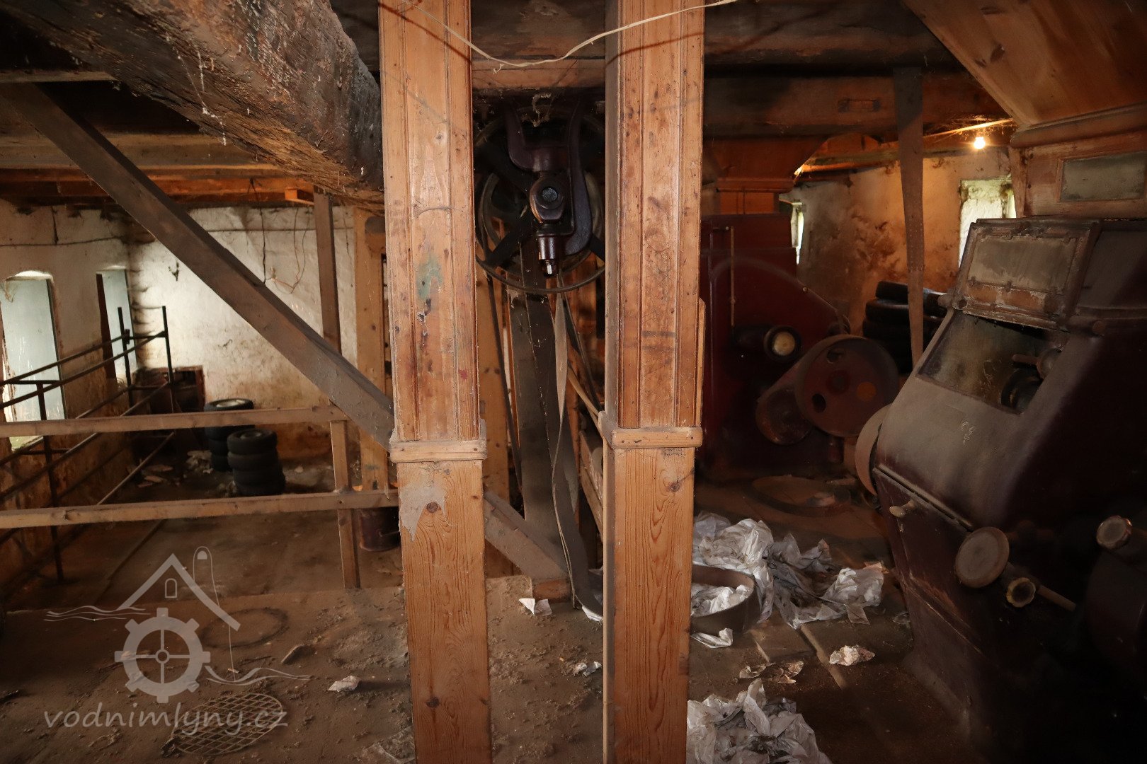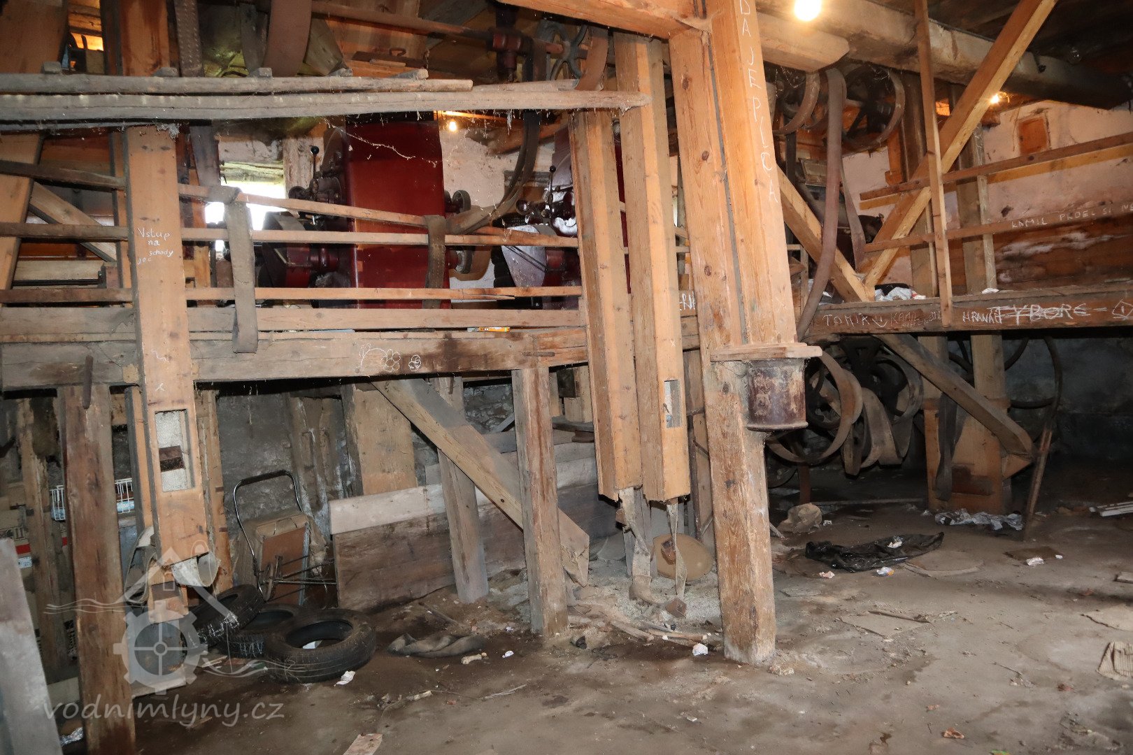 Zařízení mlýnice - suterén, 2020, © BeJi, (Prvky na obrázku: transmise, řemenice, převody, mlýnská hranice)