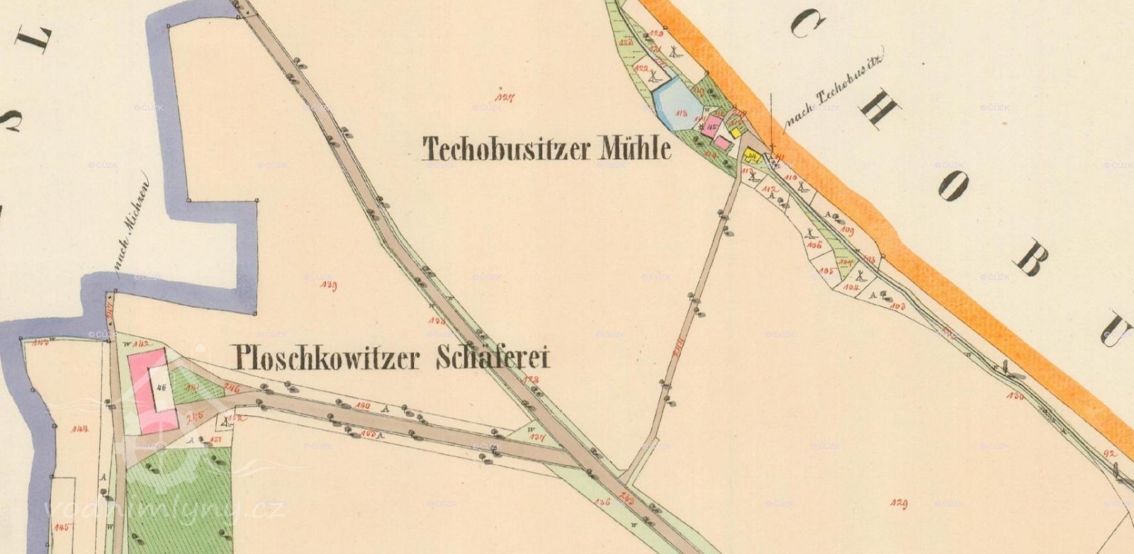 Mlýn stál nedaleko Ploskovického dvora. Stržen po roce 1954.