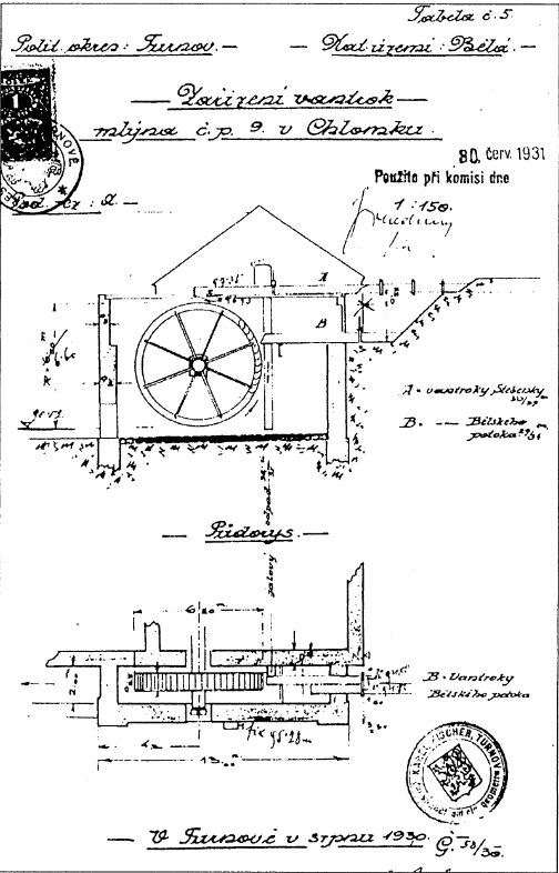 1930: dřevěnné vodní kolo na svrchní vodu (Stebenka), kombinované na střední vodu (Bělský potok), průměr kola 6,6 m, šířka lopatek 0,85 m, počet lopatek 64, užitečný spád celkem 9,58 m, u kola 7,4 m (Stebenka), u kola 4,6 m (Bělský potok), max. množství vody 40 l, max výkonnost 1,89 HP