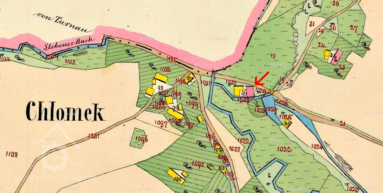 Vodní kolo mlýna Chloumku (k. ú. Bělá), o průměru přes sedm metrů, poháněla voda Stebenského potoka jako horní, voda z Bělského potoka přicházela na totéž kolo jako střední.