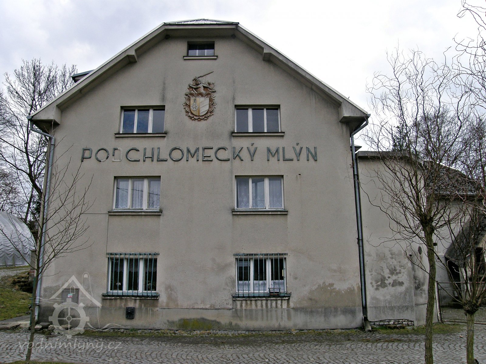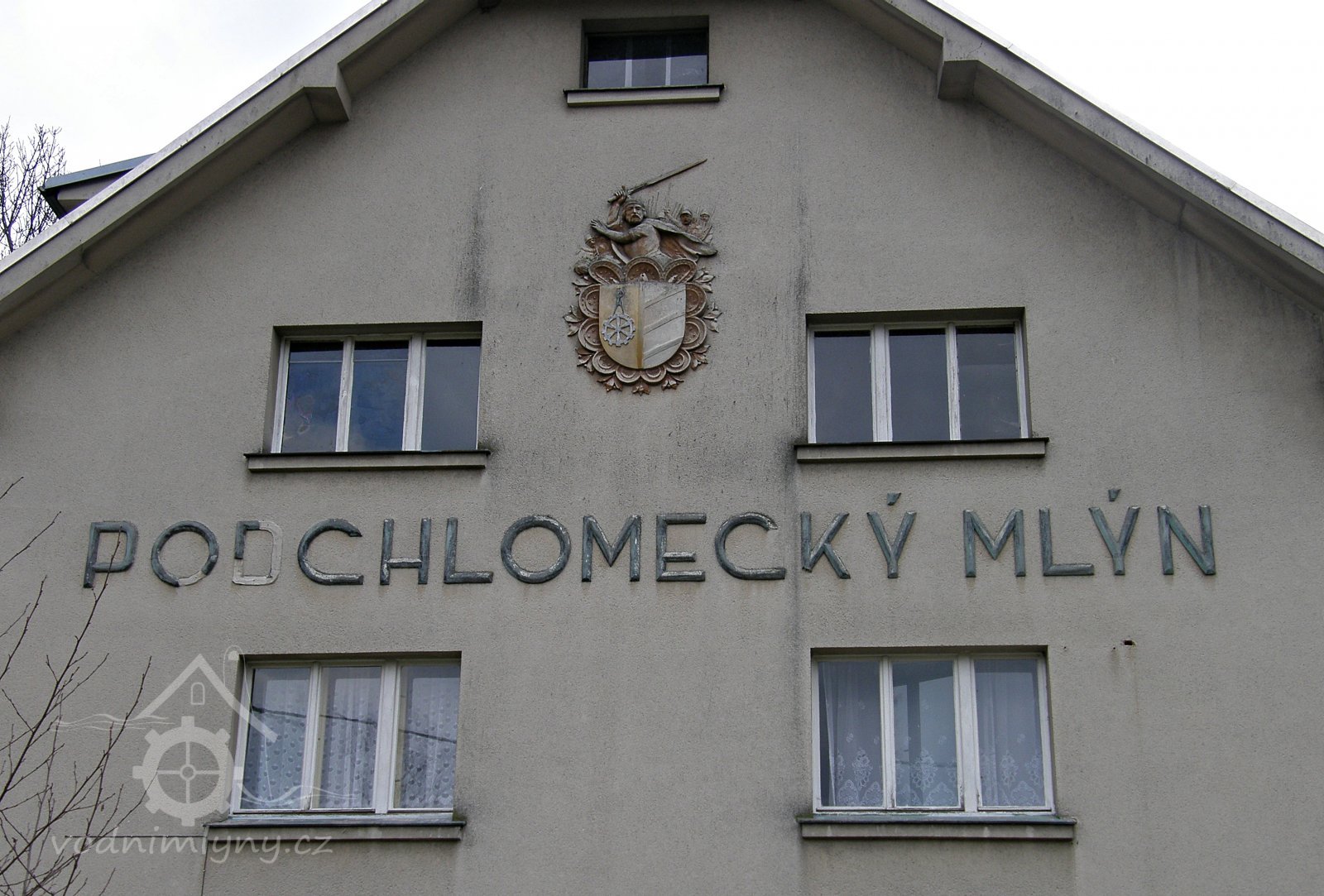 Komplex mlýnských budov s umělecky ztvárněným mlynářským znakem v průčelí mlýna.