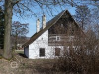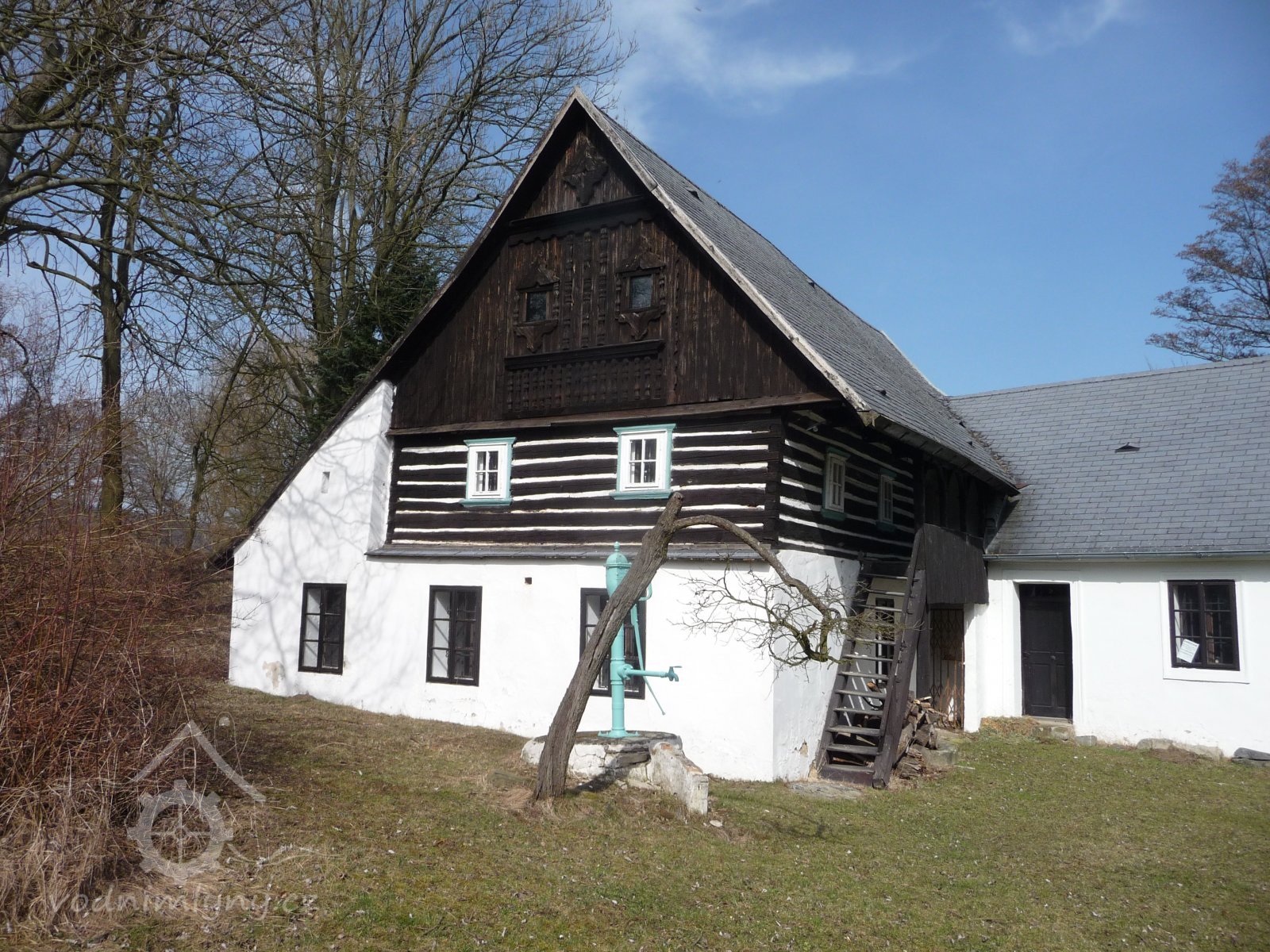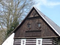 Mlýnice je zděná, obytná budova je zděná s roubeným patrem a vyřezávaným štítem.